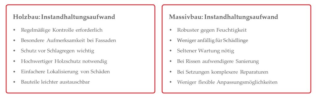 Massivhäuser sind robuster gegenüber Feuchtigkeit und Schädlingen, benötigen dafür aber bei Rissen oder Setzungen unter Umständen aufwendigere Sanierungsarbeiten.