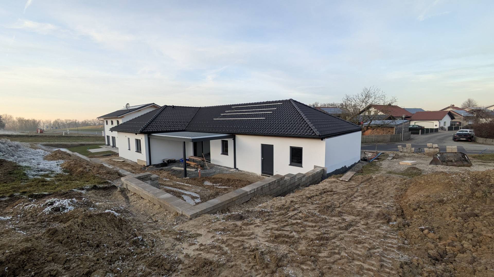 Für Michael und Verena ist es bereits das zweite Bauprojekt. Schon 2016 haben sie in derselben Ortschaft gebaut – damals ein klassisches Einfamilienhaus am Hang. Ein Bungalow kam zu diesem Zeitpunkt nicht infrage. Doch mit den Jahren, den Erfahrungen aus dem ersten Bau und dem Familienleben mit zwei Kindern wurde klar: Beim zweiten Mal möchten sie es anders machen.
