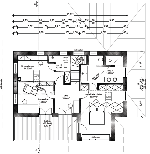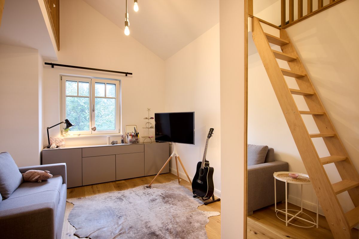 Das Wohnzimmer nebenan kann über eine Schiebewand abgetrennt werden. Ein Wohnraumofen ist ebenfalls vorhanden und bringt eine gemütliche Atmosphäre in den Wohnbereich. Über eine eingestemmte Treppe aus Eiche mit weißen Wangen und Setzstufen führt der Weg in die offene Diele im Dachgeschoss. Die Dachuntersicht im Innenbereich sowie alle sichtbaren Stützen, Pfetten und der Balkon sind ebenfalls weiß pigmentiert. Vom Schlafzimmer führt eine Leiter zur Zwischendecke über dem Bad. Das Kinderzimmer ist durch eine Zwischendecke über einem Teil des Büros erweitert. Das Elternschlafzimmer sowie das Kinderzimmer sind bis in den Dachspitz offen. Zum Kinderzimmer gehört ein eigenes Duschbad. Die Schlafräume verfügen alle über integrierte Insektenschutz-Rollos, welche bei Bedarf zugemacht werden können.