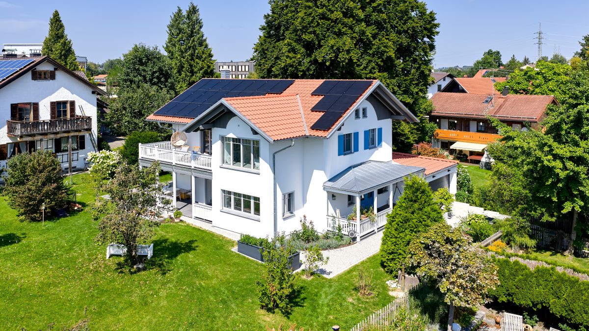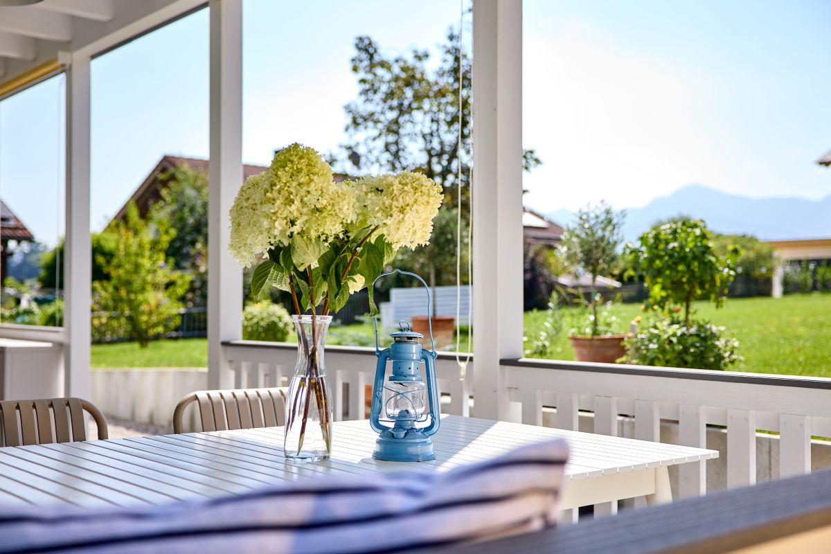 Für Außenaktivitäten steht eine zusätzliche Gartenveranda zur Verfügung, die von einem gleich großen Balkon überdacht wird. Die Fenster des Hauses, umrahmt von grauen Putzfaschen, ergänzen das harmonische Gesamtbild. Im Dachgeschoss fügen sich die Brüstungsfenster harmonisch in die Architektur ein, komplettiert durch Fensterläden in Pastellblau. Der Stil des abgerundeten Holzdesigns setzt sich auch am Giebel fort und unterstreicht die einheitliche Architektur.