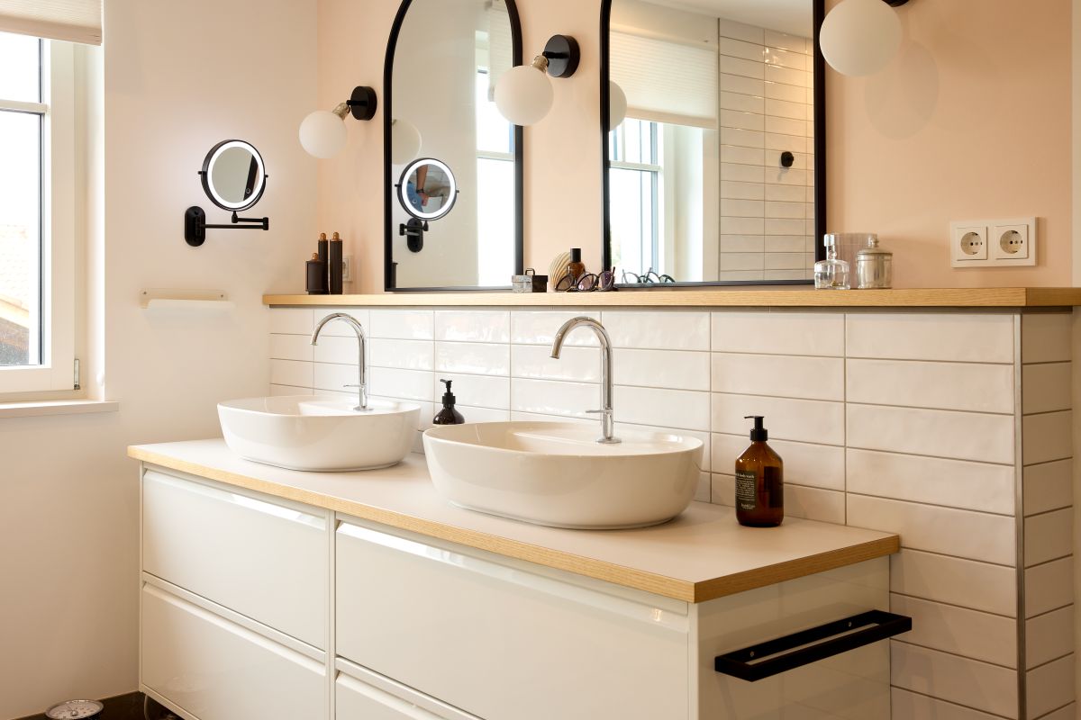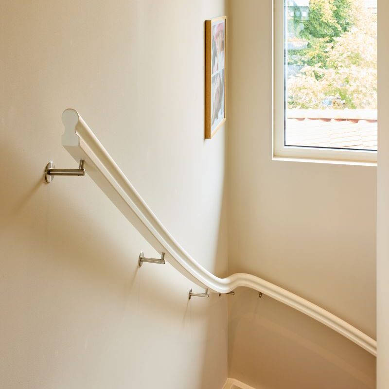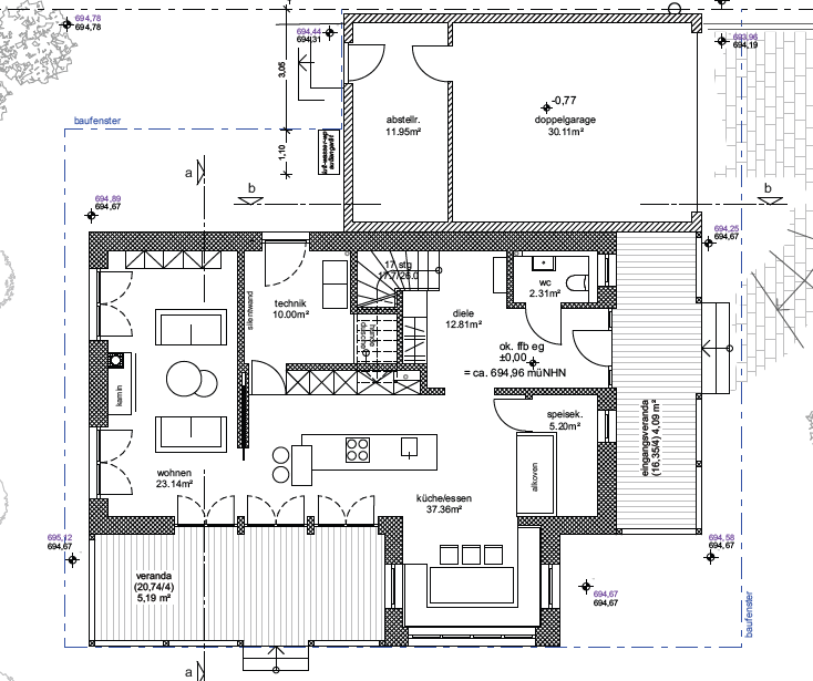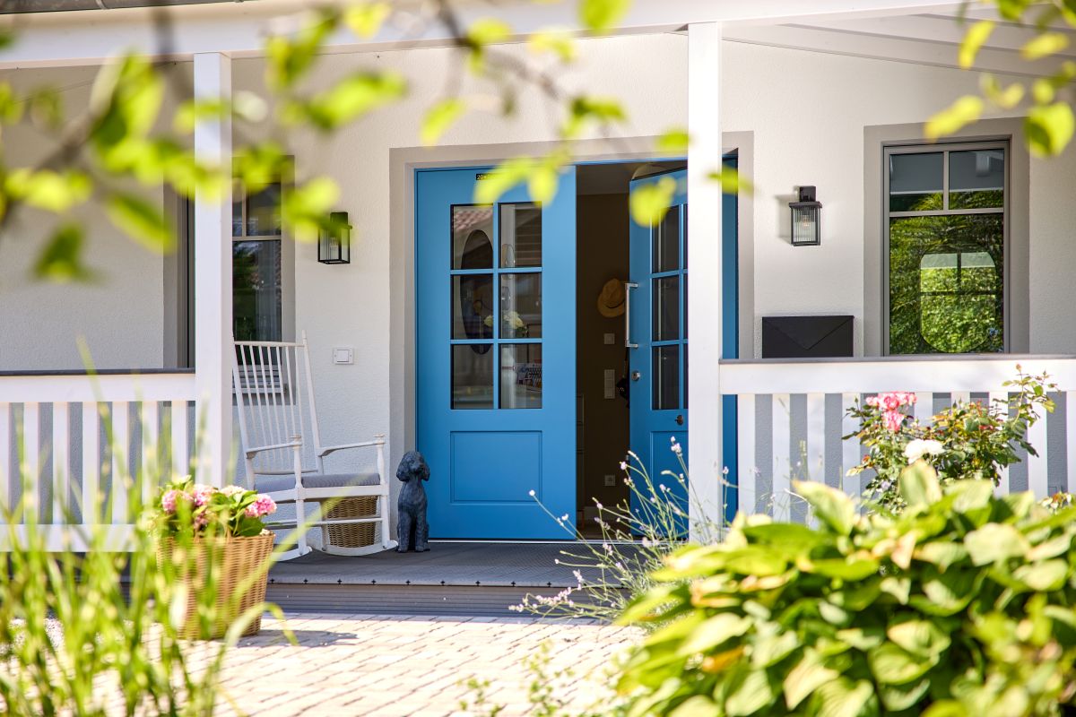 Der Eingangsbereich wirkt besonders einladend dank einer vollständig überdachten Veranda und einer großen zweiteiligen Eingangstür. Diese Tür fügt sich farblich in das Gesamtbild ein – außen in Pastellblau gestrichen und mit einem Lichtausschnitt sowie glasteilenden Sprossen versehen. Schwarz abgesetzte Türgriffe runden das Design stilvoll ab. Eine praktischerweise ebenso in Pastellblau gehaltene Nebeneingangstür ermöglicht einen direkten Zugang zum Technik- und Hauswirtschaftsraum.