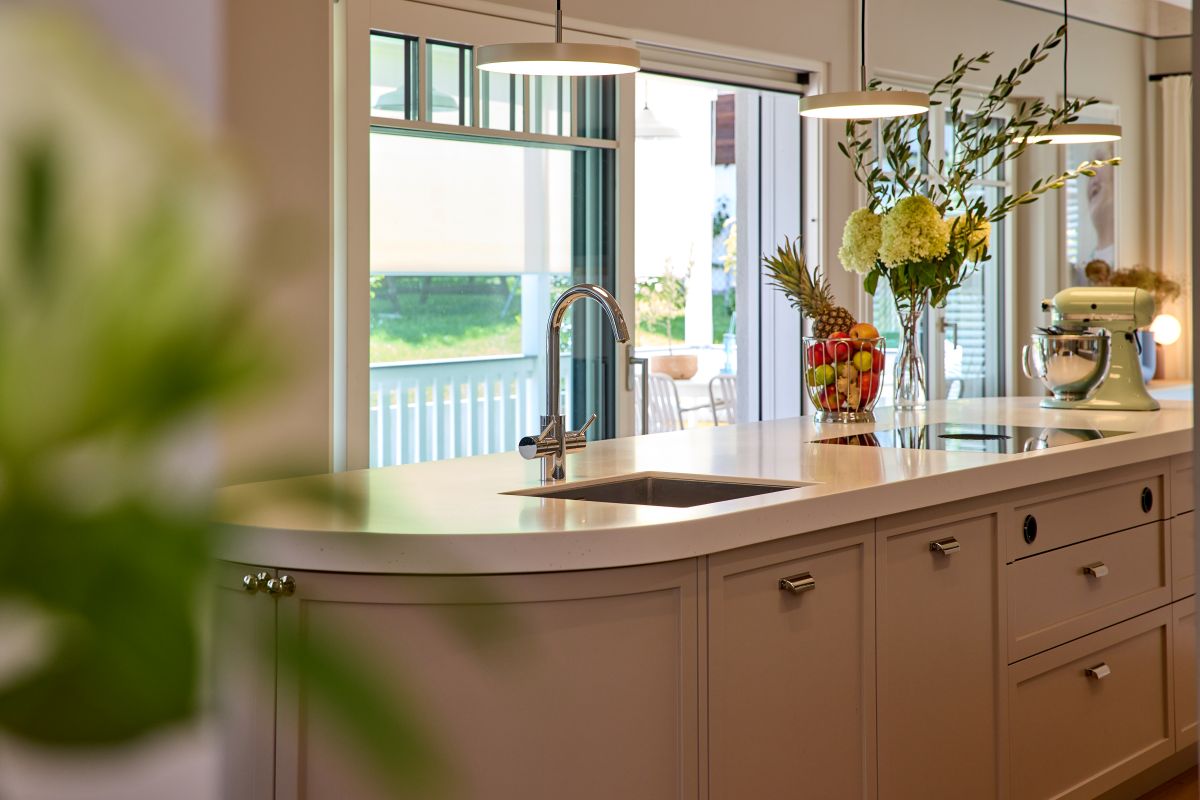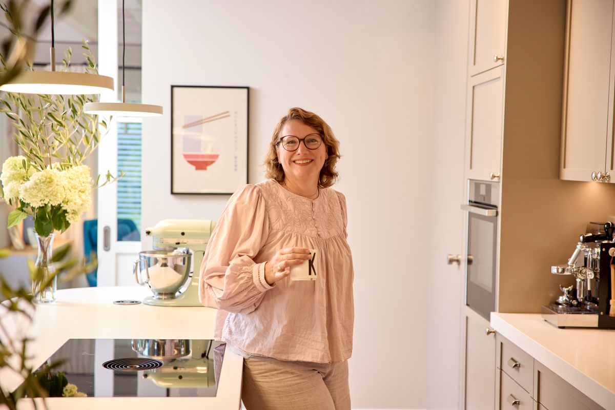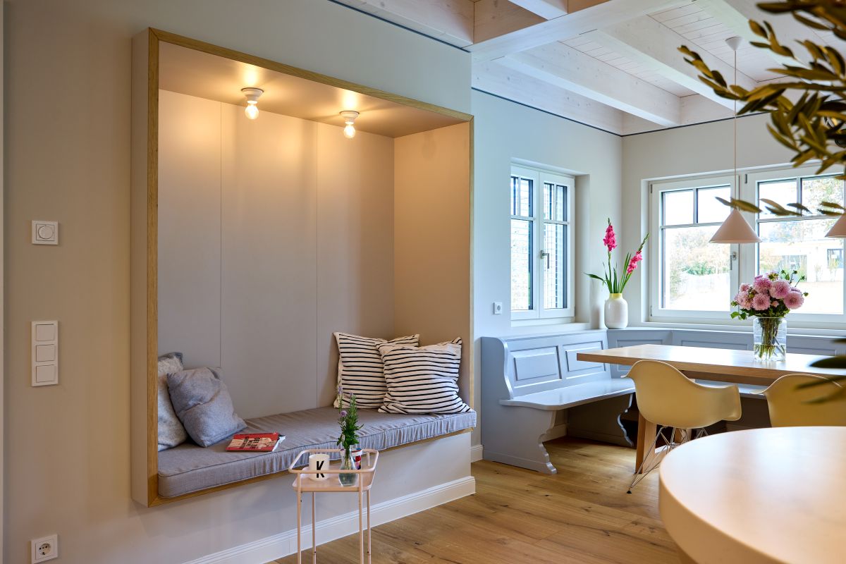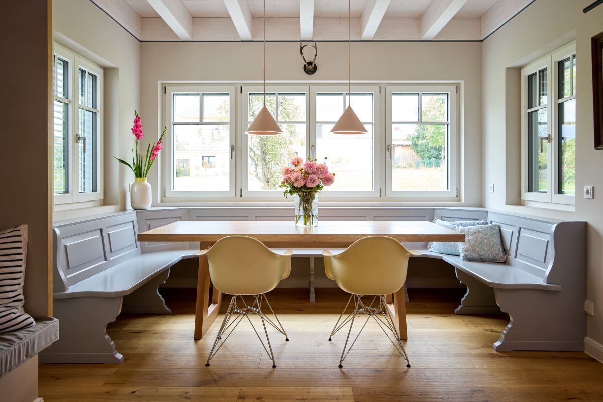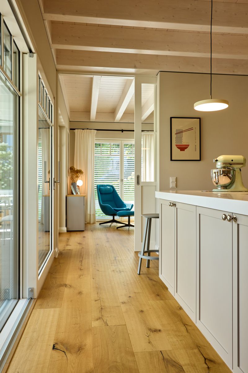 Im Wohn- und Essbereich des Hauses ist eine sichtbare Holzbalkendecke in Weiß pigmentiert. Dies verleiht den Räumen eine besondere Höhe. Die Sprossenfenster sind entsprechend dazu in deckendem Weiß gehalten und mit elektrischen Jalousien ausgestattet. Über die ausgedehnte Diele erreicht man Küche und Essbereich. Angrenzend dazu befindet sich eine separate Speisekammer mit viel Stauraum. Große, bodentiefe Fenster ermöglichen den Zugang nach draußen und lassen natürliches Licht hinein.