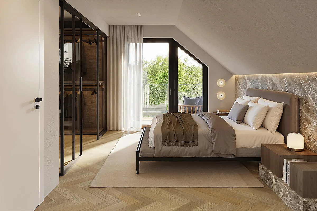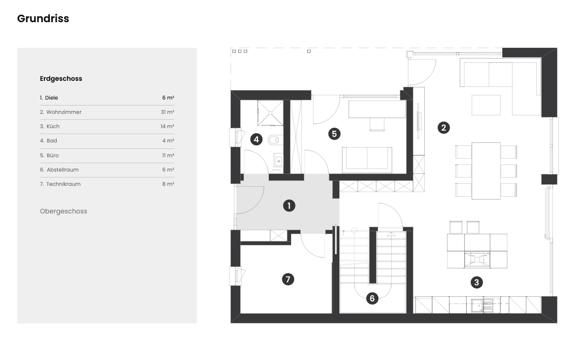 Der Wohn- und Essbereich ist ein Meisterwerk an Design und Funktion. Mit fast 40 m² erstreckt sich der Raum weit, das Licht flutet durch großzügige Fenster. Die offene Küche ist kulinarischer Mittelpunkt und Kommunikationsraum zugleich. Der nahtlose Übergang zum Garten schafft eine Atmosphäre von Freiheit und Großzügigkeit. Der Grundriss funktioniert durch die Anordnung des Zimmers im Erdgeschoss auch als Haus mit kleinem Einlieger, das zusätzliche Flexibilität bietet.
