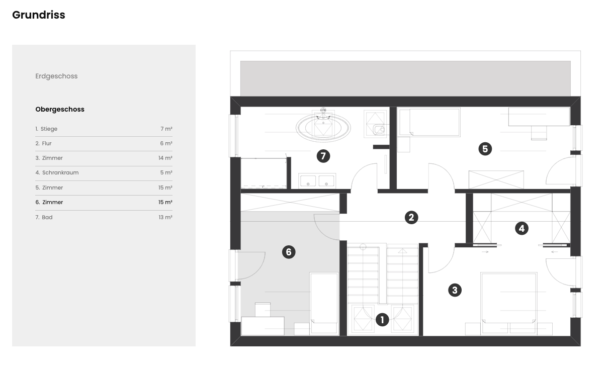 Das Satteldach – ein Klassiker, neu interpretiert. Der 2 Meter hohe Kniestock und die 35° Dachneigung verleihen dem Gebäude eine beeindruckende Silhouette. Die Fassade kombiniert schlichte Eleganz mit warmen Akzenten. Besonders ist, dass alle Bauteile, bis auf den Erker, entfallen können, wodurch auch ein vereinfachtes Gebäude mit demselben Grundriss möglich ist. Integrierte Überdachungen schaffen zusätzlichen Stauraum, während die optionale Garage das Gesamtbild perfekt abrundet.