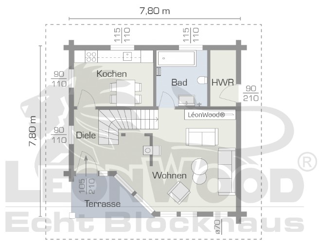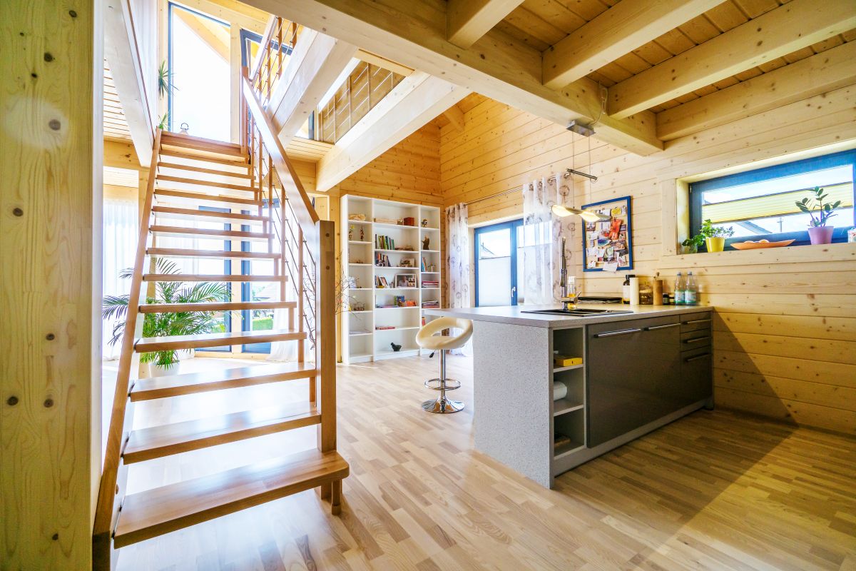 Die Außenwand des Hauses besteht aus einer mehrschaligen Bauweise, bei der parallel angeordnete Blockbohlen eine 19 Zentimeter starke Dämmschicht aus Korkgranulat umschließen. Dieses von LéonWood® eingesetzte Wandsystem, die BIO-Doppelwand®, bietet sehr gute Wärmedämmwerte und unterstützt damit eine energieeffiziente Wohnweise. Gleichzeitig sind Holz und Kork natürliche, diffusionsoffene Materialien, die zu einem angenehmen Raumklima beitragen und gesundes Wohnen fördern.