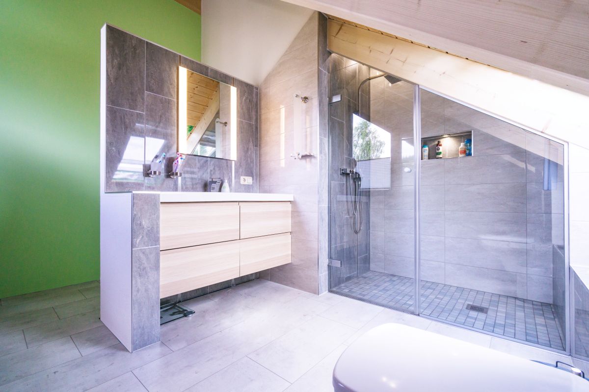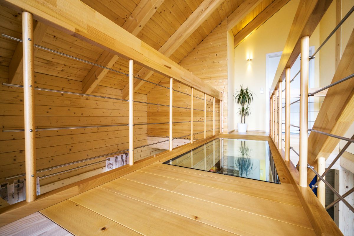 Im Erdgeschoss ergänzen weitere Räume das Wohnkonzept. Dazu gehören unter anderem ein Arbeitszimmer, ein Hauswirtschaftsraum, eine Speisekammer sowie ein Gäste-WC. Im Obergeschoss befinden sich die privaten Rückzugsorte des Hauses: Schlafzimmer, Kinderzimmer und Familienbad. Ein besonderes Element ist der verglaste Steg, der in den offenen Galeriebereich führt. Dieser Bereich eignet sich hervorragend als Lounge oder Ruhezone und bietet einen weiten Ausblick auf die Umgebung sowie in den Wohnraum.