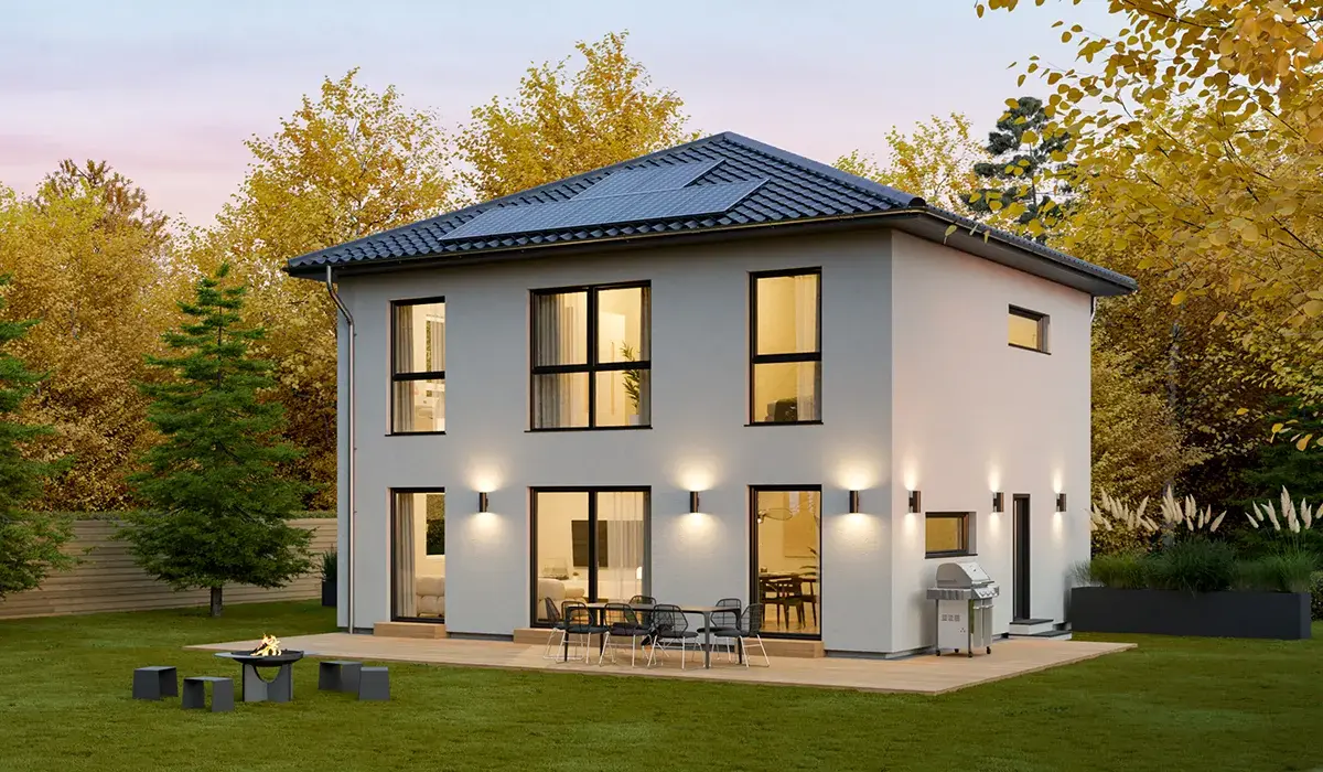 Diese zweigeschossige Stadtvilla von STREIF verbindet modernes Design mit einem repräsentativen und zugleich behaglichen Wohngefühl. Das Herzstück des Hauses bildet der großzügige Wohn-, Ess- und Kochbereich, der dank drei Terrassentüren und einem zusätzlichen Fenster von natürlichem Licht durchflutet wird – ideal für ein offenes und lebendiges Familienleben.