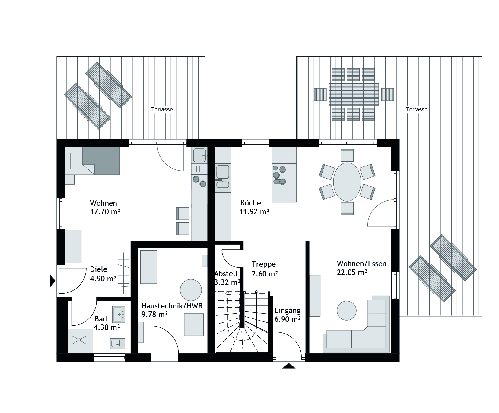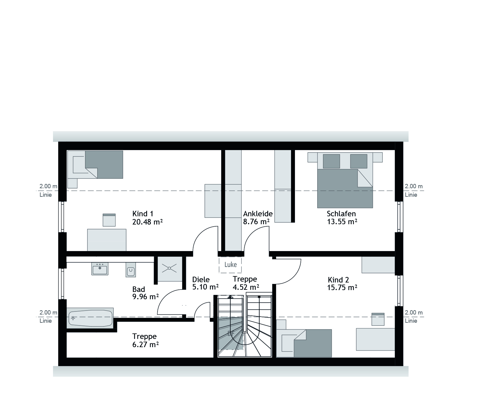 Die abgebildeten Grundrisse dienen als Gestaltungsvorschläge und lassen sich individuell anpassen. Ausgenommen hiervon sind die Position der Bäder sowie die Größe und Lage des Haustechnikraums. Je nach gewählter Haustechnik und den örtlich geltenden Bauvorschriften können Änderungen am Grundriss erforderlich sein. Alle Angaben sind Circa-Werte. Abhängig von Grundriss- und Dachgestaltung ist eine Ökobilanzierung nach KFWG-Standard bei den Ausstattungslinien „Premium“ und „Queensline“ möglich. Unsere STREIF-Bauberatungen informieren Sie gerne über aktuelle Fördermöglichkeiten. Abbildungen können Sonderausstattungen oder Anbauteile zeigen, die nicht im Lieferumfang enthalten sind.