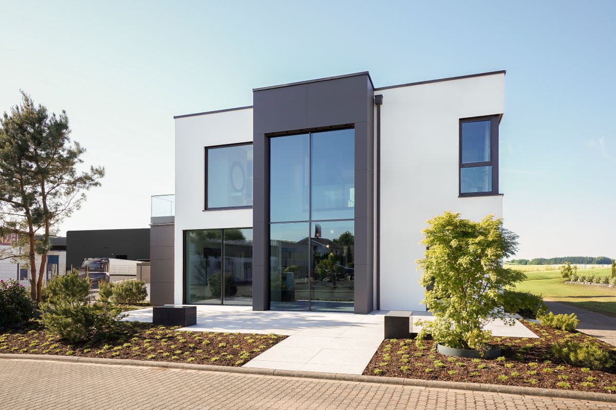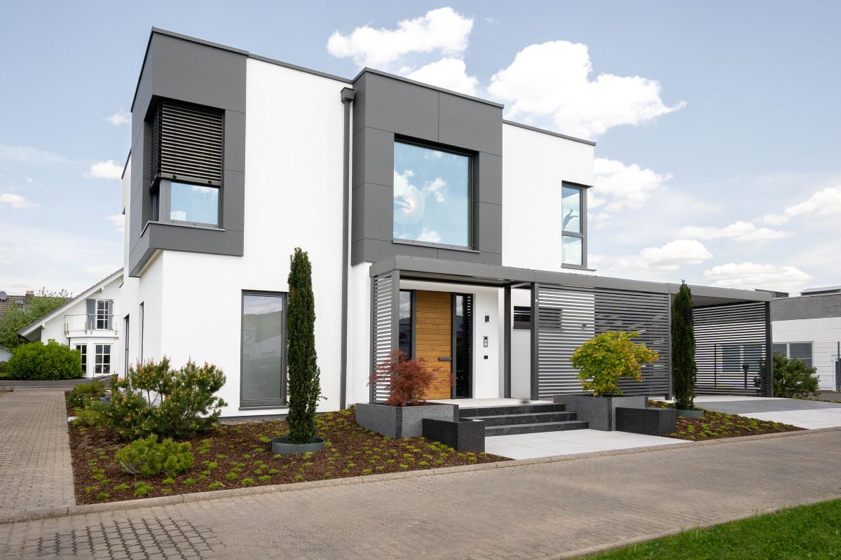 Die Erkerverkleidung besteht aus einem PREFA-Fassadensystem aus Blech in der Farbe Anthrazit. Das Design wird durch einen Carport mit integrierter Haustürüberdachung ergänzt, welches als einheitliches Gestaltungselement dient.
