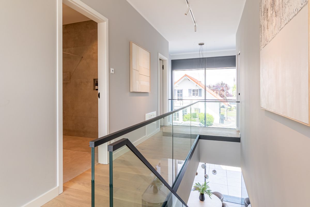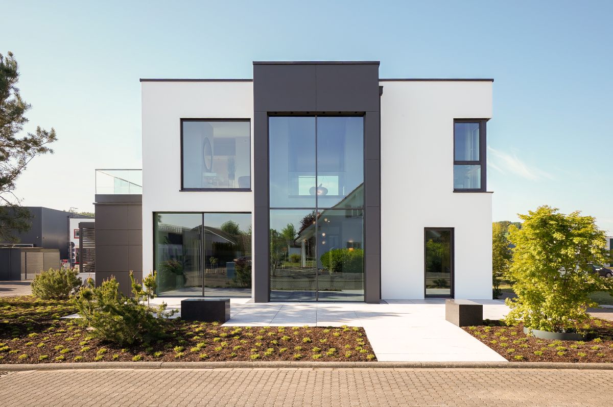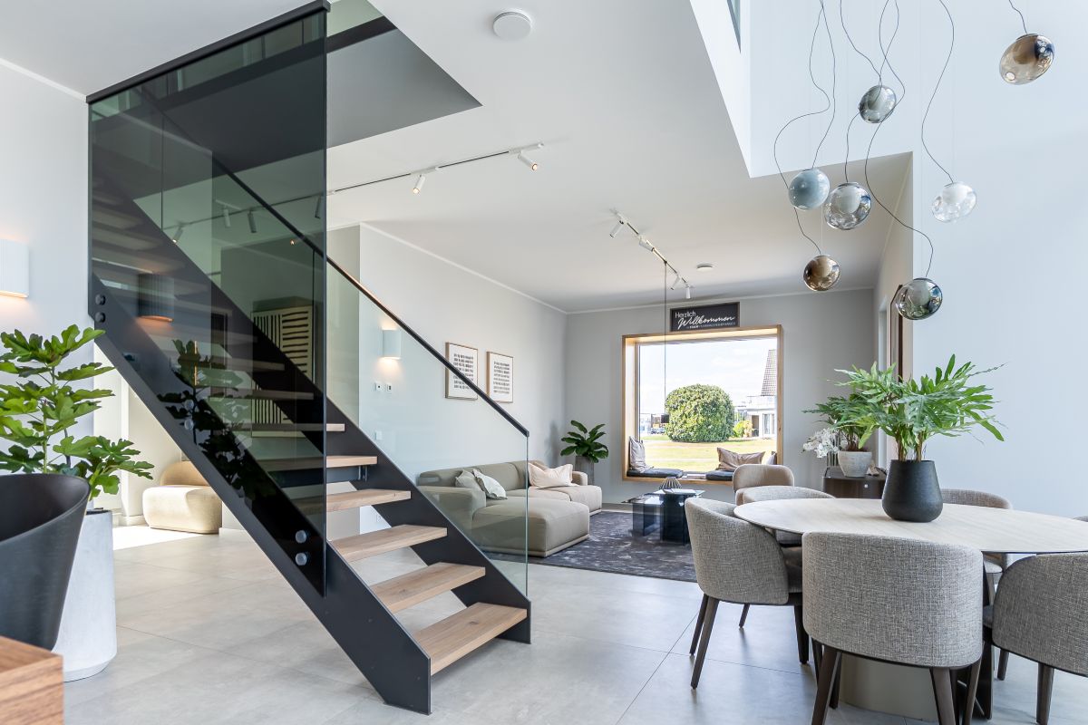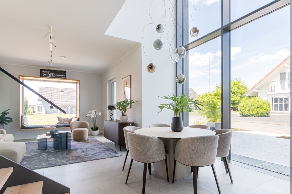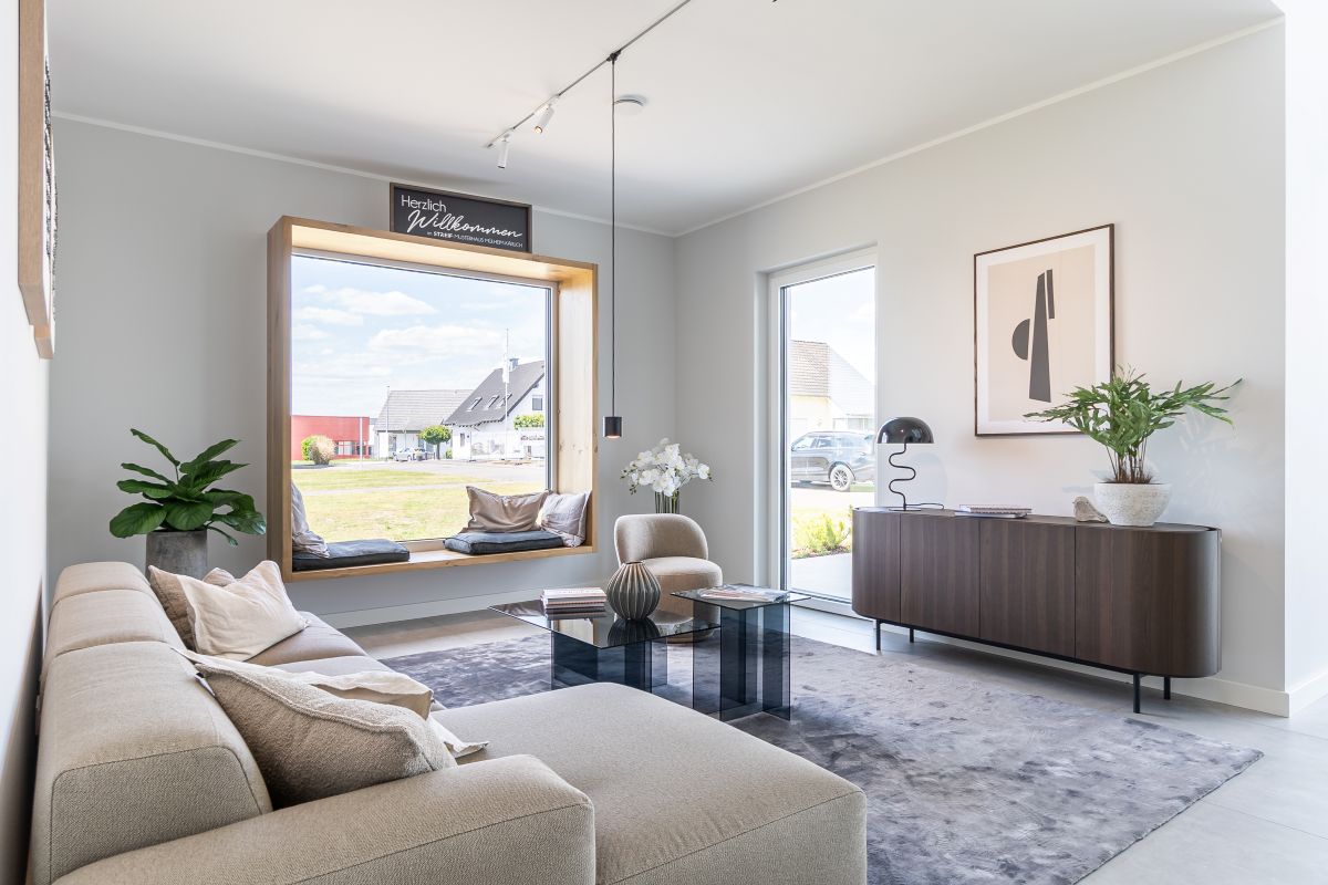 Das Musterhaus von Streif bietet auf einer Netto-Raumfläche von 201,68 m² eine Reihe an architektonischen Highlights. Hierzu gehört der zweigeschossige Erker, der mit einer großen Glasfront ausgestattet ist. Die Fenster sind mit Sonnenschutzverglasung versehen und sorgen für helle, lichtdurchflutete Räume. Die rahmenlose Schiebetürenanlage und das Panorama-Sitzfenster ergänzen das offene und moderne Design des Hauses. Beide Geschosse wurden auf eine lichte Raumhöhe von 2,95 m erhöht, was ein großzügiges Raumgefühl vermittelt.