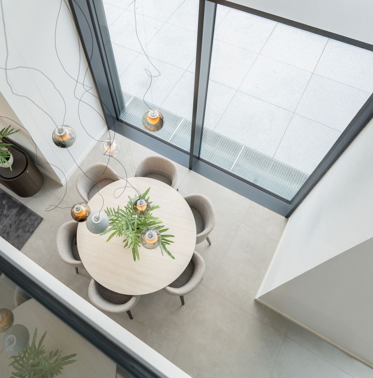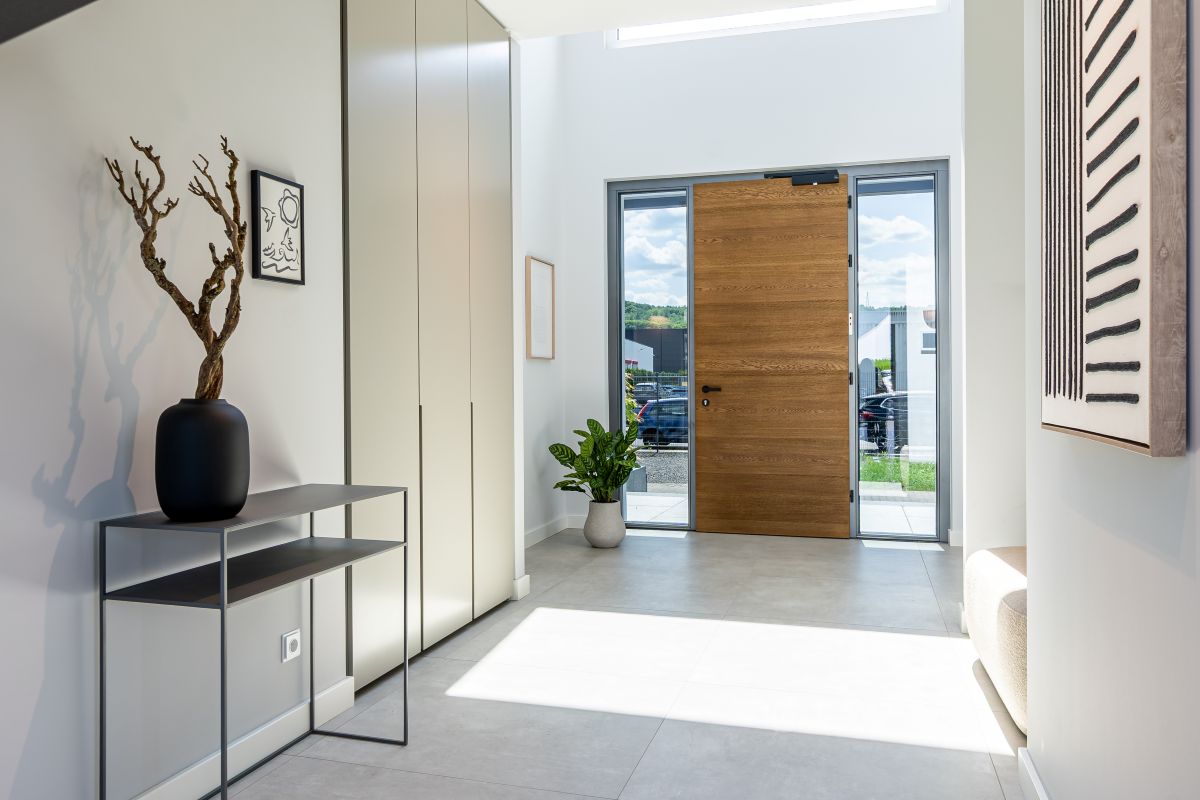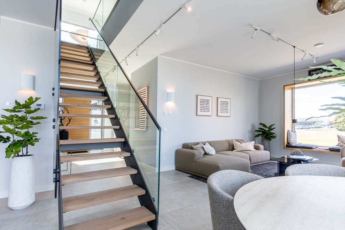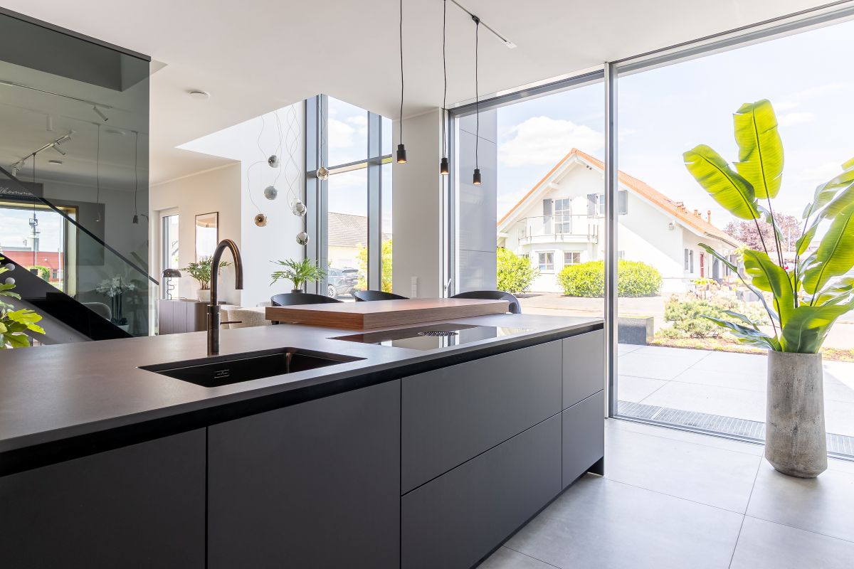 Das Musterhaus von Streif bietet auf einer Netto-Raumfläche von 201,68 m² eine Reihe an architektonischen Highlights. Hierzu gehört der zweigeschossige Erker, der mit einer großen Glasfront ausgestattet ist. Die Fenster sind mit Sonnenschutzverglasung versehen und sorgen für helle, lichtdurchflutete Räume. Die rahmenlose Schiebetürenanlage und das Panorama-Sitzfenster ergänzen das offene und moderne Design des Hauses. Beide Geschosse wurden auf eine lichte Raumhöhe von 2,95 m erhöht, was ein großzügiges Raumgefühl vermittelt.