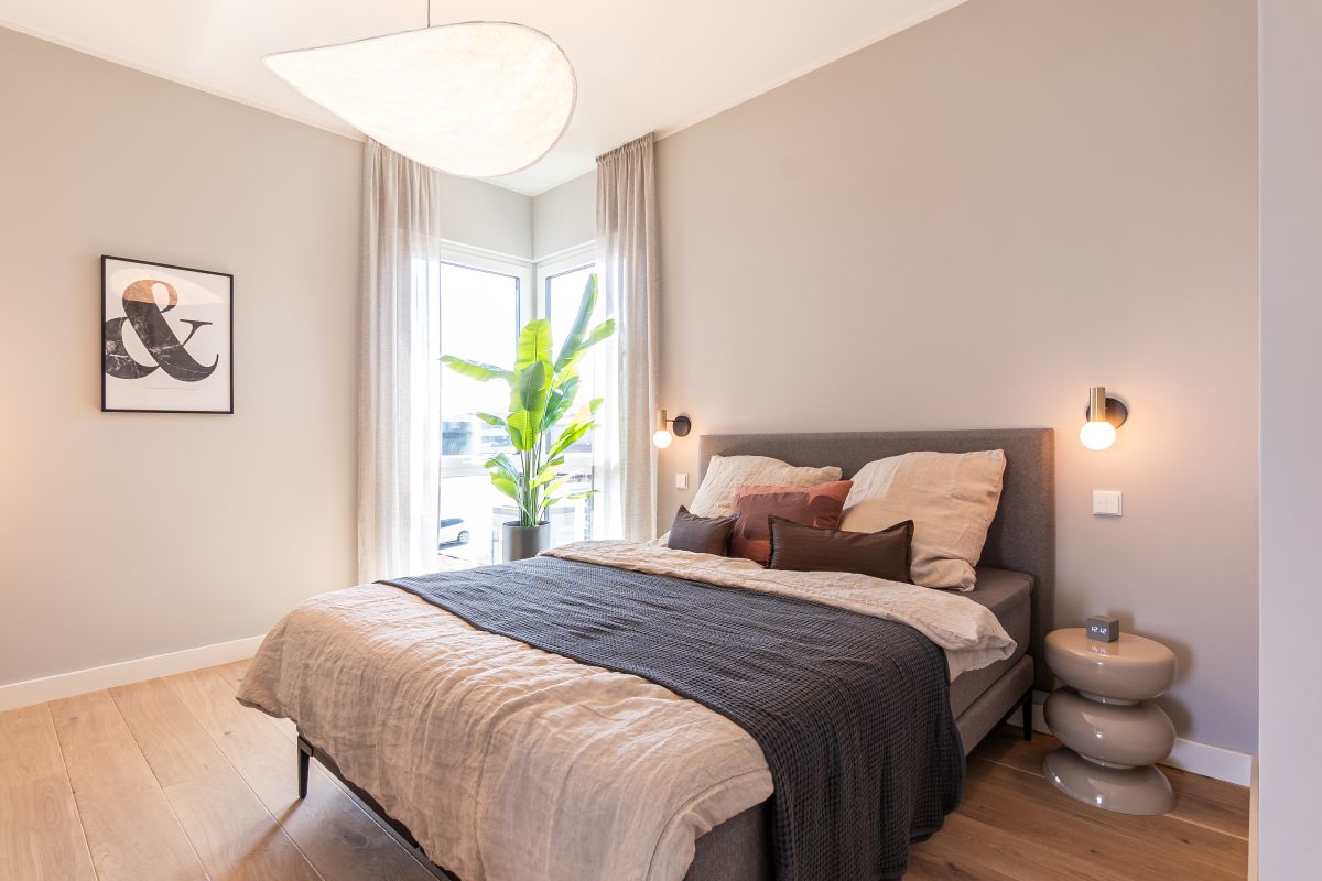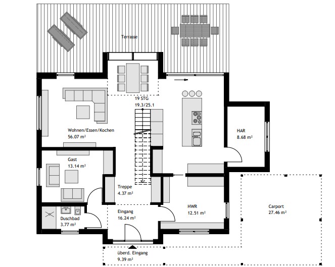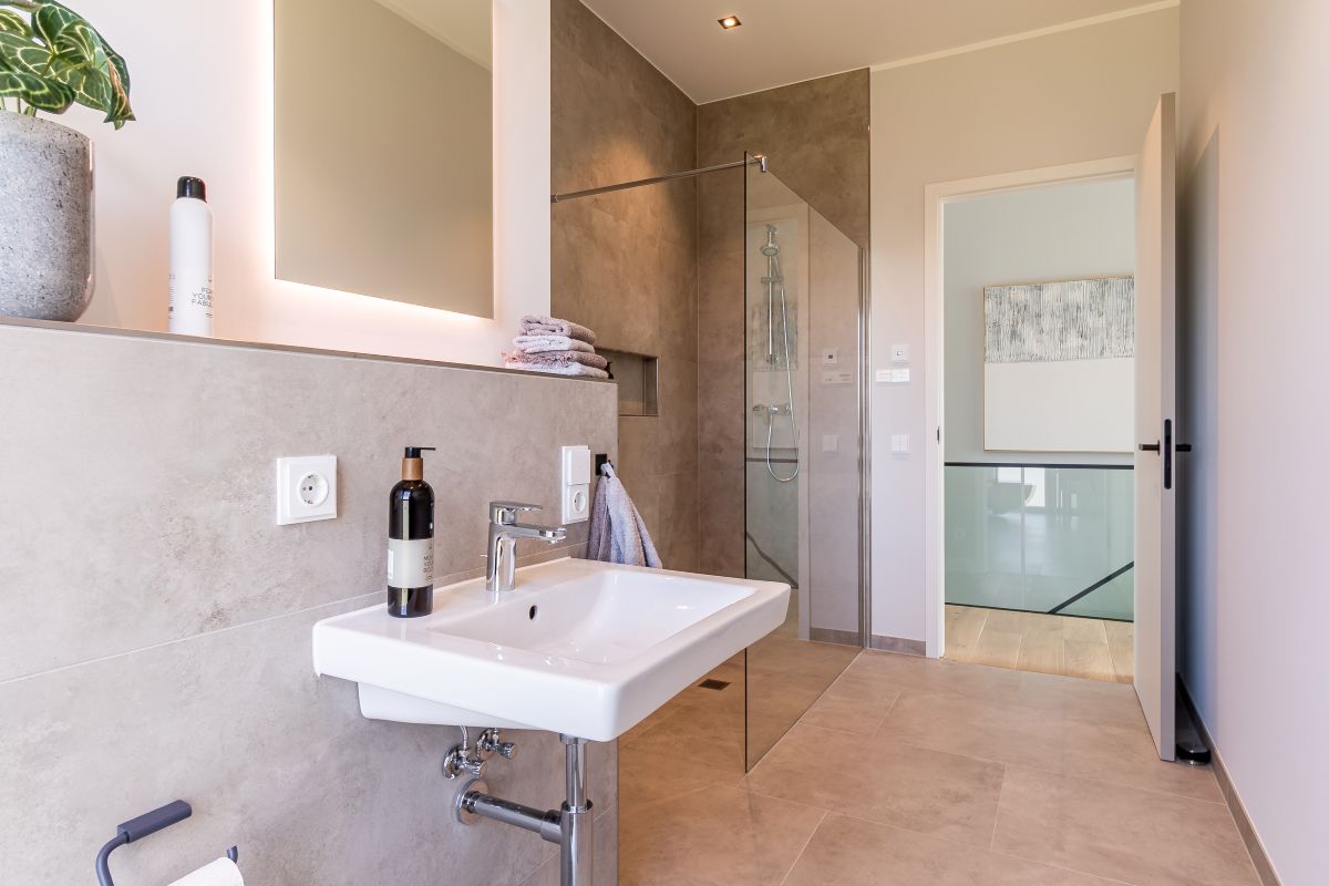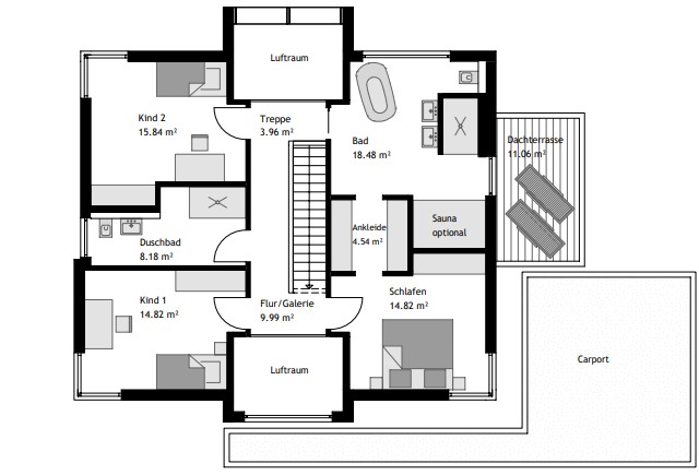 Das Erdgeschosses verfügt über einen 56 m² großen Wohn-, Ess- und Kochbereich, der durch Nischen mit Einbauschränken optimal genutzt wird. Ein Duschbad und ein zusätzlicher Raum, den die Bewohner*innen als Homeoffice, Gästezimmer oder Hobbyraum nutzen können, runden das Raumangebot ab. Im Obergeschoss finden sich zwei große Kinderzimmer mit eigenem Duschbad. Die zwei Galerien sorgen für ein offenes Raumgefühl. Der Elternbereich ist mit einer Ankleide und einem geräumigen Bad en Suite ausgestattet.