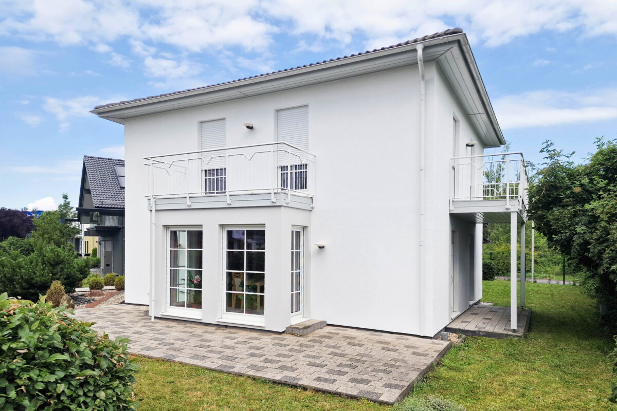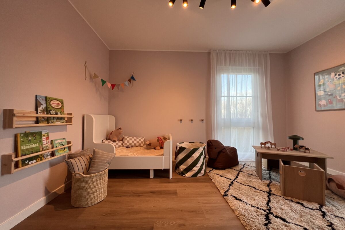 Im Obergeschoss befinden sich zwei gleich große Kinderzimmer, ein Elternschlafzimmer und ein familienfreundliches Bad. Von zwei der Räume aus ist der Zugang zum Balkon möglich – perfekt für entspannte Momente im Freien.