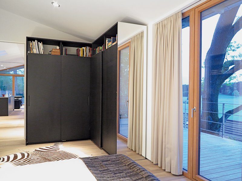 Die Lösung: ein eingeschossiges, lang gestrecktes Gebäude mit einer Terrasse auf Stelzen, das sich har­monisch in den Baumbestand integriert und dabei auf ­luftiger Höhe wunderbare Blicke in die Landschaft erlaubt.