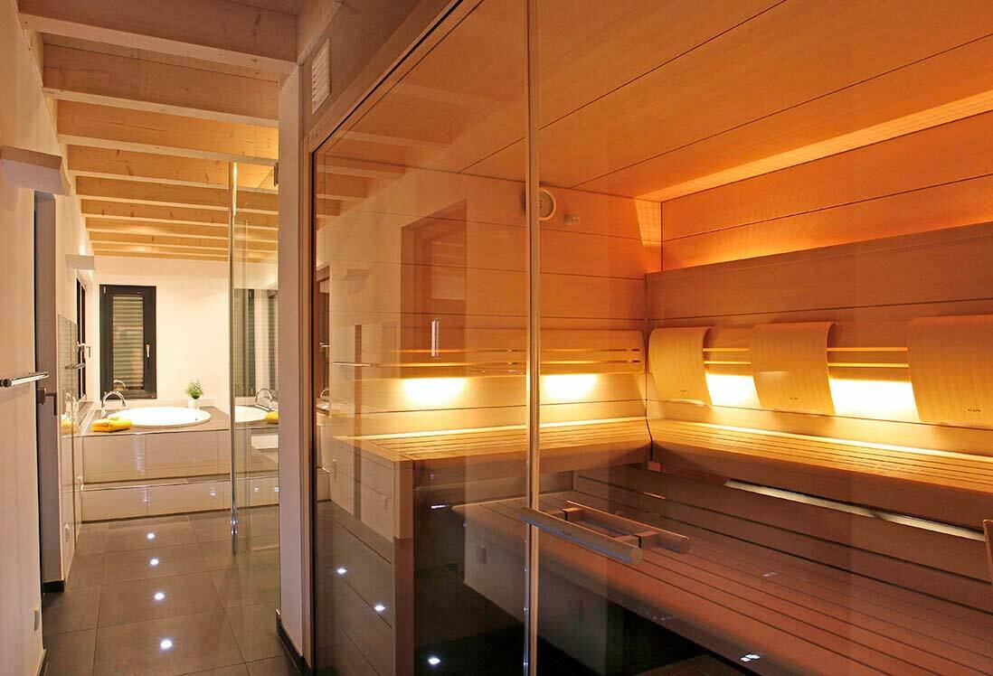 Im oberen Stockwerk erschließt ein langer Flur mit praktischen Einbauschränken den Kinder- und den gegenüber liegenden Elterntrakt. Beide „Parteien” haben hier jeweils ihr eigenes, großzügiges Badezimmer mit Dachterrassen-Zutritt, gemeinsamen Spa-Spaß gibt es in der Familiensauna zwischen Elternbad und Ankleide.