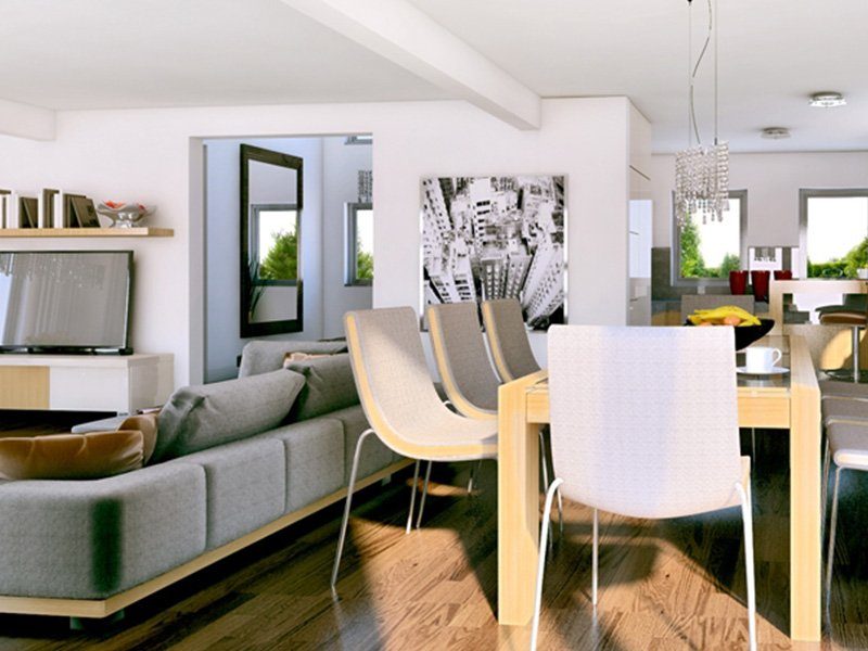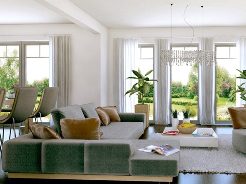 Preis für Effizienzhaus-40-Standard: schlüsselfertig inklusive Maler, Fliesen, Laminat, Teppichboden und Technikpaket (Luft-Wasser-Wärmepumpe + Fußbodenheizung + zentrale Lüftungsanlage mit Wärmerückgewinnung) ab Oberkante Bodenplatte.