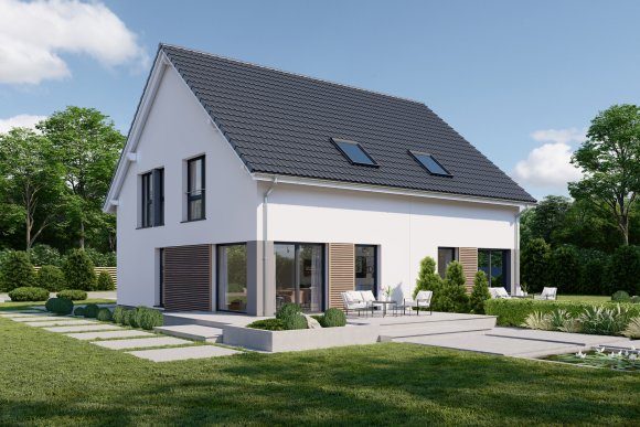 Eineinhalbgeschossige Doppelhaushälfte mit vier Zimmern, Ankleide, Küche, Bad, Gäste-WC, Technikraum und Diele. Satteldach mit 40° Dachneigung, Kniestock 1,25 m.