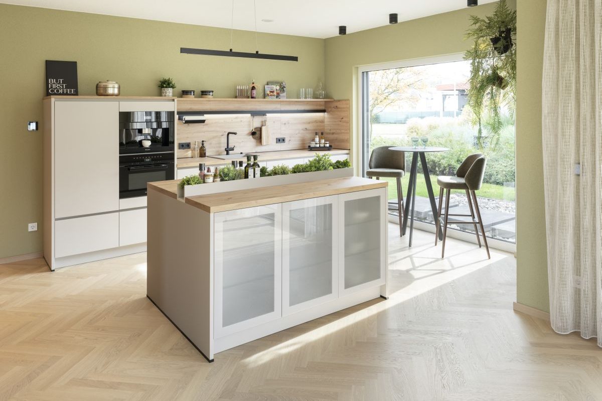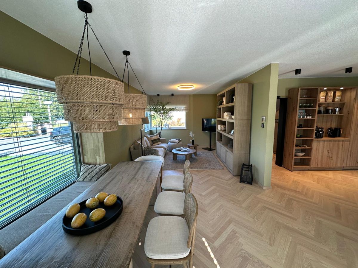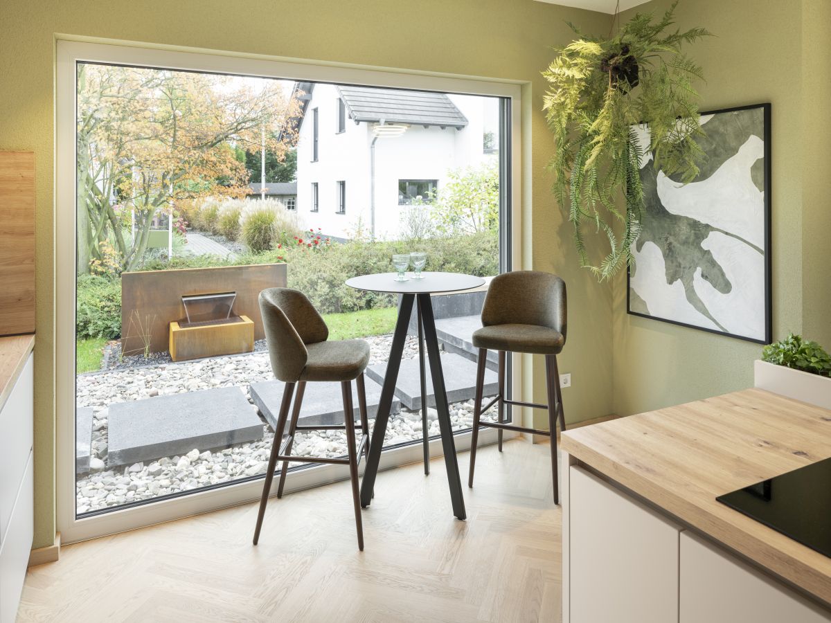 Das Musterhaus ist geprägt von einer modernen Architektur im wohnlichen Scandi-Style. Die 168 Quadratmeter Wohnfläche verteilen sich auf zwei Etagen und bieten eine durchdachte Raumaufteilung. Nachhaltigkeit steht hier im Fokus: Die energiesparende Bauweise und der Einsatz regenerativer Heiztechnik wird durch ein extensiv begrüntes Schrägdach ergänzt. Klare Linien und eine moderne Formsprache bestimmen das Hauskonzept, welches sowohl in ländlicher als städtischer Umgebung realisiert werden kann. Variable Anbauteile ermöglichen eine flexible Anpassung bei der Gestaltung des Grundrisses, ohne Verzicht auf Wohnkomfort.