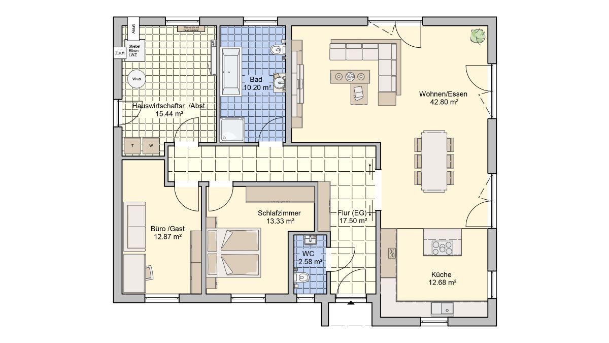 Neben einem geräumigen Badezimmer, einem Hauswirtschaftsraum und dem Schlafzimmer findet sich noch ein weiterer Raum der beispielsweise als Büro dienen, oder zu einem Kinderzimmer umfunktioniert werden kann. Das Gäste-WC im Eingangsbereich sorgt für eine perfekte Nutzung der insgesamt 127,43qm Wohnfläche.