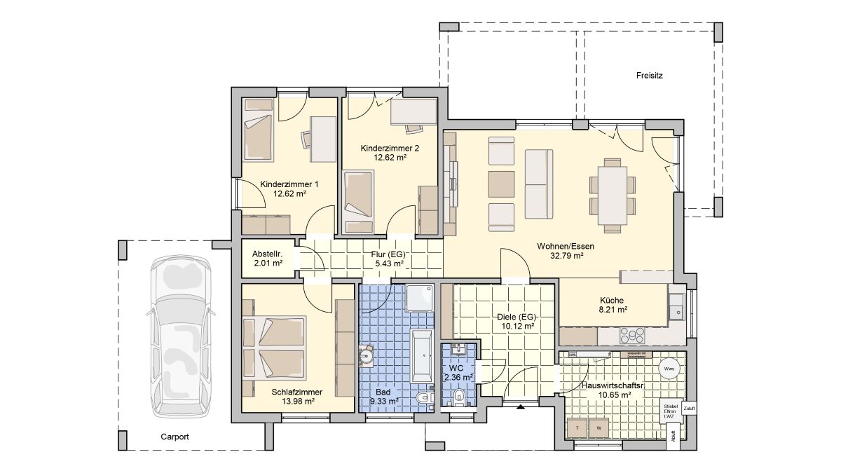 Der Bungalow eröffnet viele individuelle Gestaltungsmöglichkeiten und lässt keine Wünsche offen. So kann das Gebäude beispielsweise um moderne Anbauten wie eine an das Wohn- und Esszimmer angrenzende Terrasse sowie einen vom Haus zugänglichen Carport erweitert werden. Der Flachdachbungalow eignet sich für eine drei- oder vierköpfige Familie und charakterisiert das moderne Wohnen im 21. Jahrhundert.