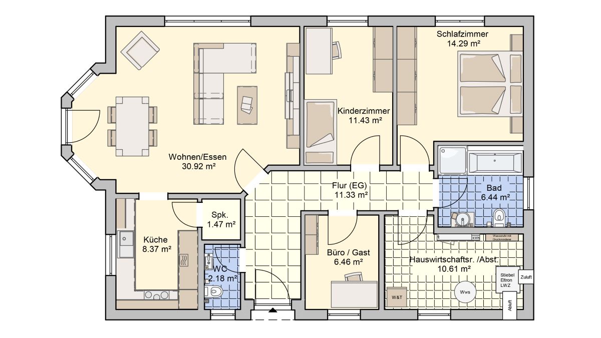 Der Bungalow Loko schafft Nähe durch offene Raumstrukturen, aber auch ausreichend Rückzugsmöglichkeiten. Diese bieten sich in Form von Wohn- und Essbereich, einem Kinderzimmer sowie dem geräumigen Schlafraum. Auf 103 m² Wohnfläche finden der Nachwuchs sowie Vater und Mutter ausreichend Platz, um sich individuell zu ent-falten. Ein Büro oder Gästezimmer kann ebenfalls ideal integriert werden. Die Optik des Bungalows wird definiert durch modernste klare Bauweise und das traditionelle Walmdach, das sich mit 25-prozentiger Neigung über dem Fingerhut Haus erstreckt. Der Walmdachbungalow von Fingerhut Haus: Wohnen über alle Altersgrenzen hinweg.