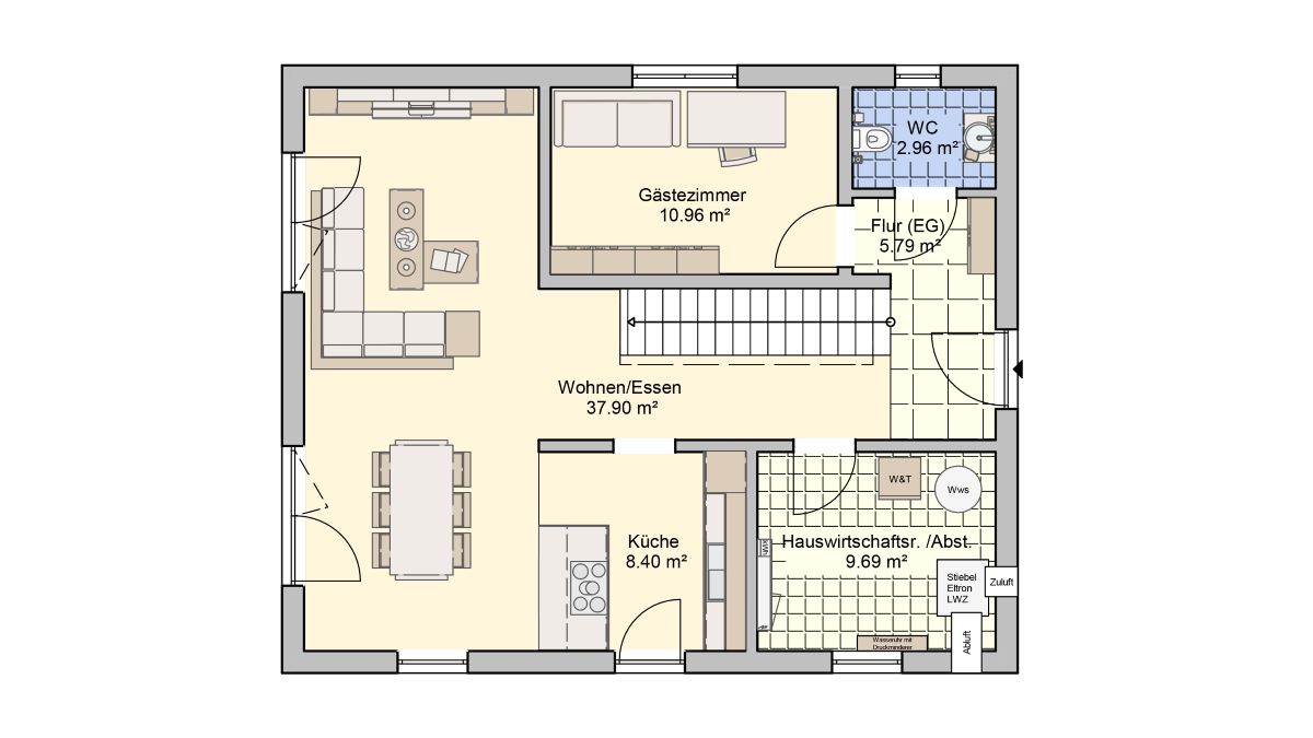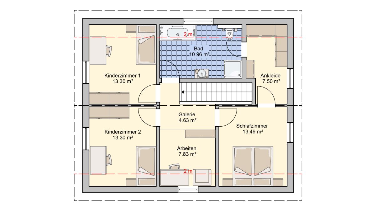Eine gerade, schlanke Silhouette: Das Fingerhut Haus Mainz. Aufgrund des erhöhten Kniestocks von 1,80 Meter bietet es viel Kopffreiheit und ist trotz kompakter Außenmaße ein echtes Raumwunder. Ideal für schmale Grundstücke. Für junge Familien besonders interessant: Zwei gut geschnittene Kinderzimmer im Dachgeschoss und ein großzügiges Gästezimmer im Erdgeschoss, welches auch als weiteres Kinderzimmer nutzbar ist. Ein Schlafzimmer mit Ankleide, ein schönes Bad und ein Arbeitsbereich finden ebenfalls bequem im Obergeschoss Platz. Giebelseitig sorgen jeweils zwei große doppelflügelige, bodentiefe Fensterelemente für einen optimalen Lichteinfall.