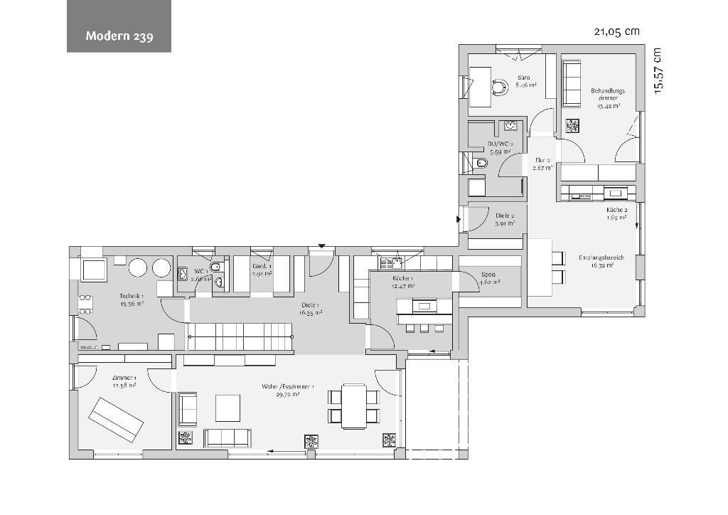 Der Entwurf Modern 239 von Fischerhaus mit Anbau ist eine freie Planung für eine junge Familie. Sie wünschte sich einerseits viel Platz zum Wohnen und Arbeiten und andererseits wenig Energiekosten. Erstaunliche knapp 240 Quadratmeter Wohnfläche sind auf den zwei Geschossen des Satteldachhauses und seinem Flachdach-Anbau untergebracht.