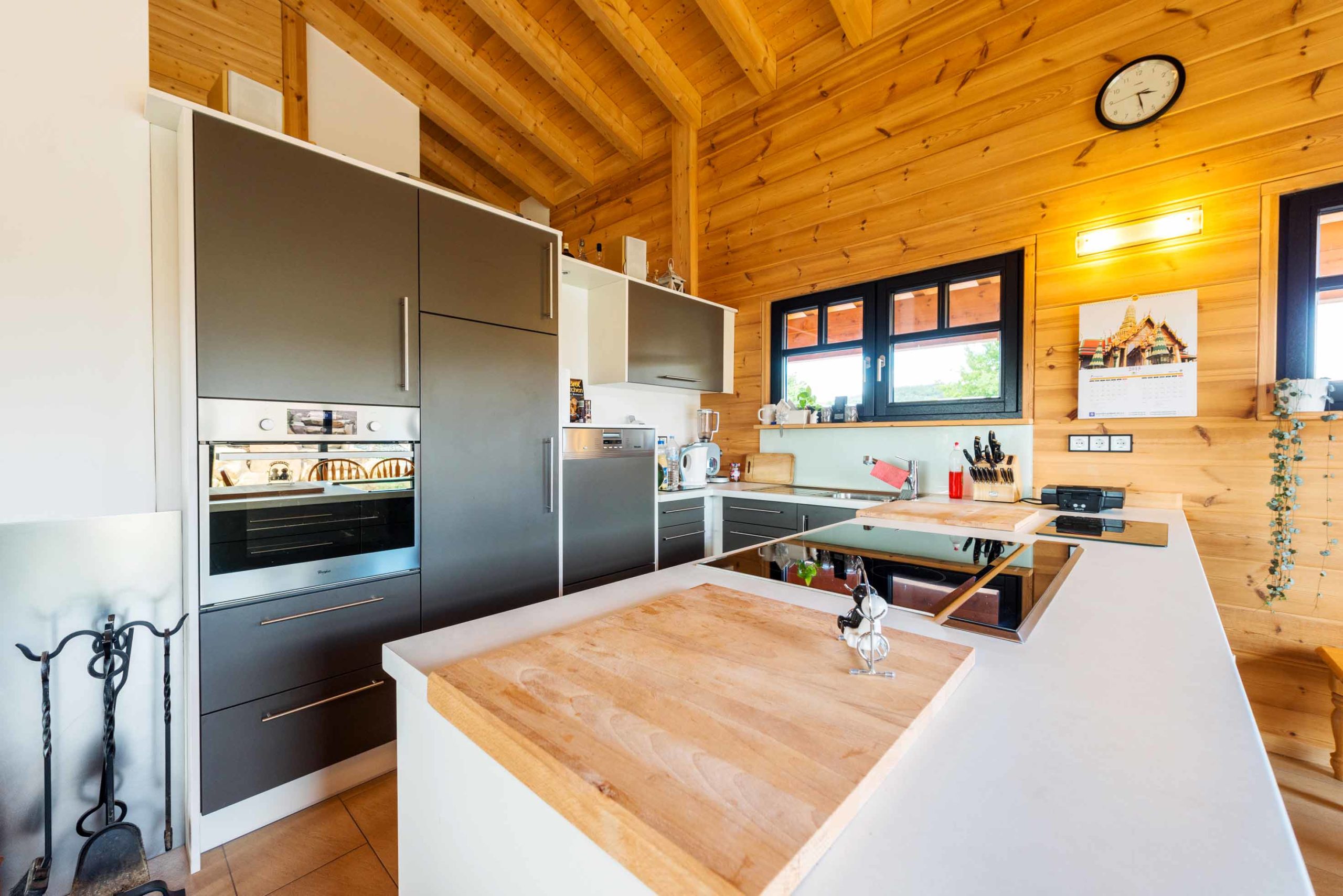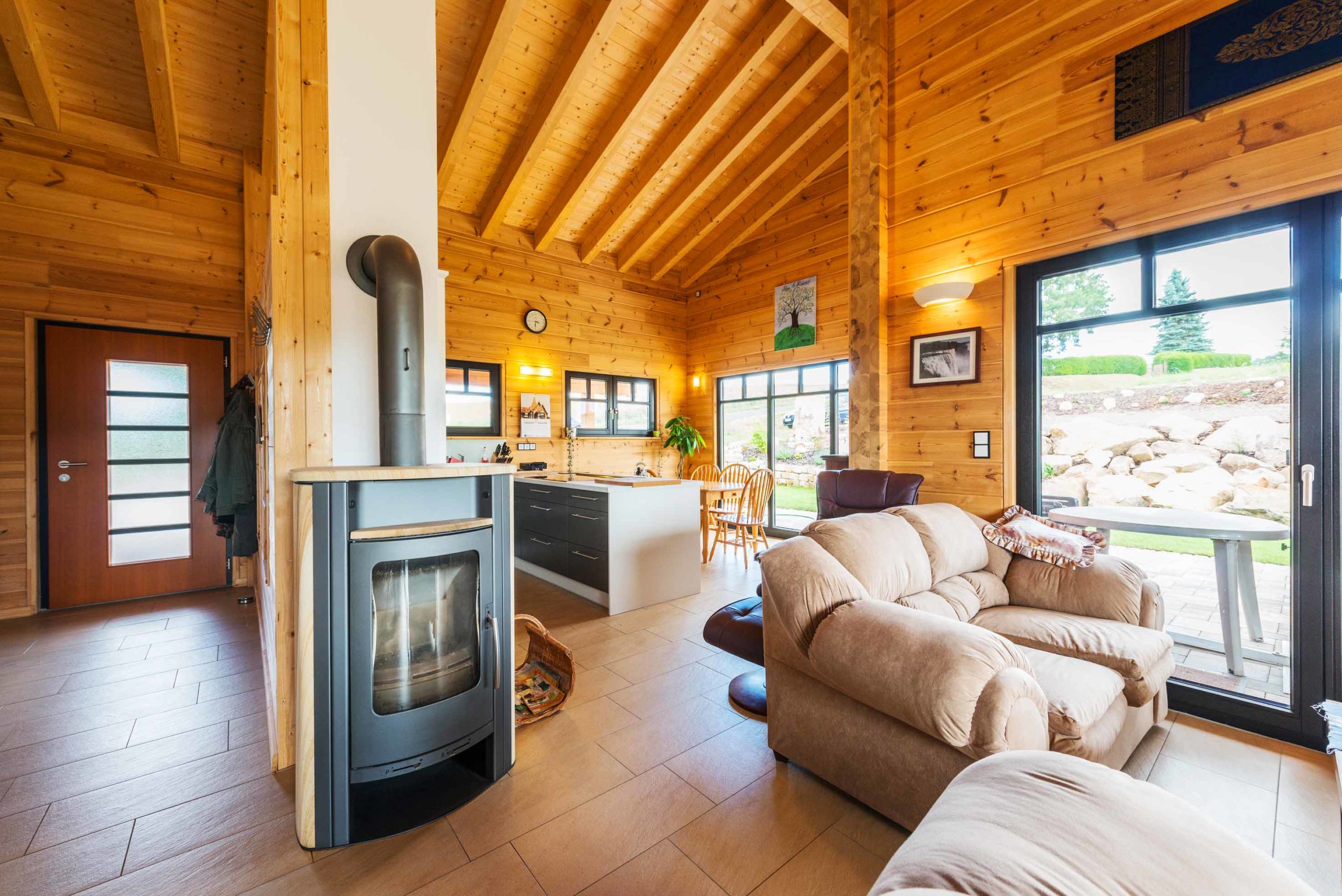 Haus „Unterfranken“ ist ein Bungalow in einschaliger Holzblockbauweise, dessen Freisitzen unterm breiten Dachüberstand man kaum widerstehen kann. Die rote Dacheindeckung und der warme Ton der Holzfassaden erhöhen die einladend-freundliche Ausstrahlung, während große Glasflächen mit asymmetrischen Sprossen dem Haus einen Schuss Modernität verleihen.