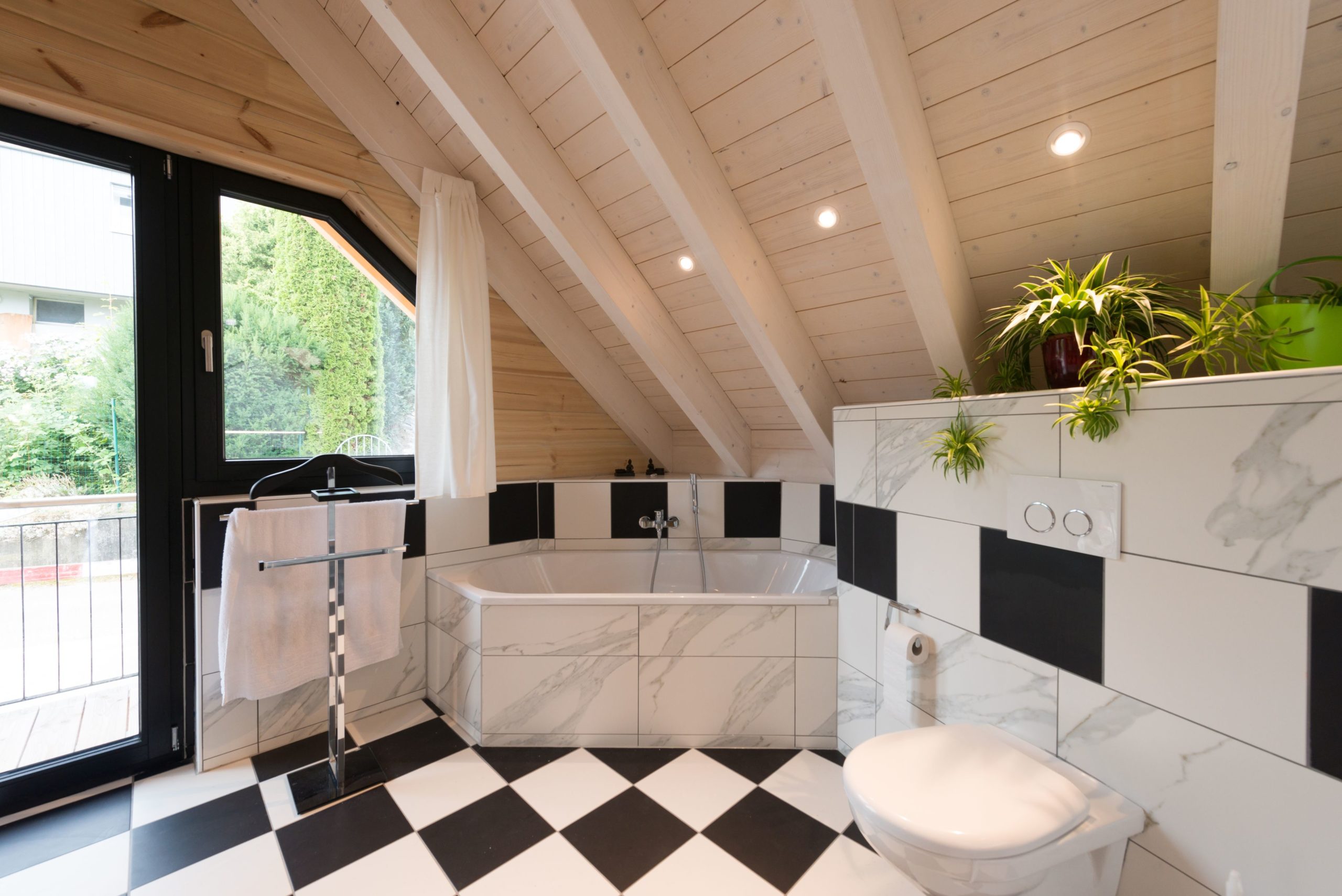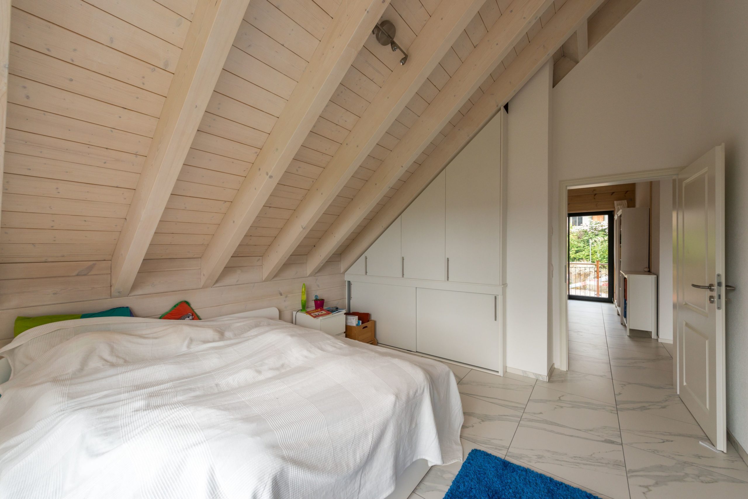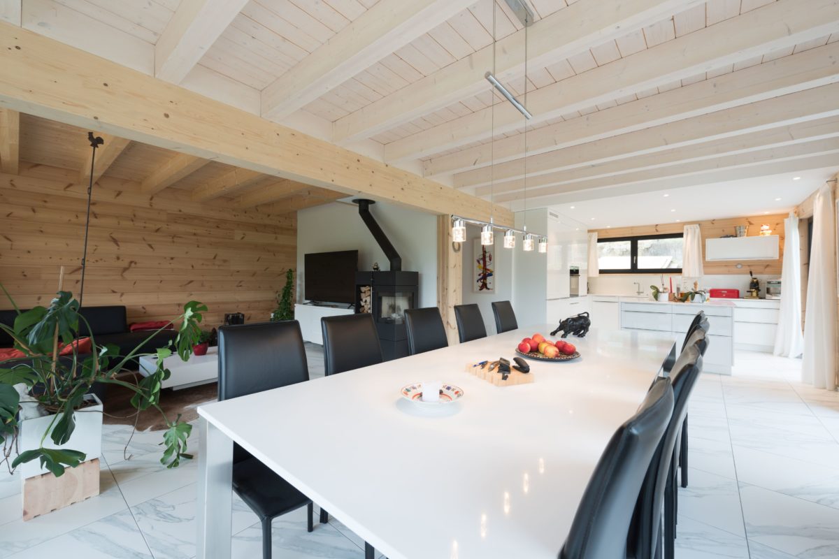 Man betritt den rechteckigen Grundriss an der Ostseite (Bergseite) und gelangt in eine große, lichte Empfangshalle mit bis zum Firstbalken hohen Luftraum. Von dort schwingt sich eine helle Holztreppe hinauf auf die Galerie, die zum Büro, zum Schlafzimmer und zum Wohnbad führt. Bleibt man in der Diele im Erdgeschoss findet man ein Gäste-Bad/WC vor, den Abgang ins Untergeschoss sowie den doppelflügeligen, offenen Zugang zum Wohnbereich. Dieser ist ebenfalls offen und sehr großzügig gehalten: Küche, Esszimmer und Wohnzimmer befinden sich in dem L-förmigen Raum und gehen fließend ineinander über. Allein der offene Wohnbereich nimmt drei Viertel des Erdgeschosses ein. Im ganzen Haus legt Boris Frischknecht viel Wert auf maximale Helligkeit und hat deshalb alle Holzwände mit UV-Schutz vor dem Nachdunkeln bewahrt; weiß verputzte Trennwände (Leichtbau) zu den tragenden Massivholzwänden kombiniert; weiße, leicht marmorierte Bodenfliesenrechtecke verlegen lassen; die offene Sichtbalkendecke im Essbereich mit milchiger Lasur aufgehellt; weiß glänzende Küchenmöbel ausgewählt und über der Küche viele Lichtspots in die dort glatte, weiß gestrichene Zimmerdecke integriert. Das reichlich einfallende Tageslicht bringt alles zum Strahlen. Die moderne Einrichtung in weiß und schwarz harmoniert hervorragend mit dem bodenständigen, naturhellen Holz und nimmt dem Blockhaus nicht seinen typischen Charakter. Den wollte der Hausherr unbedingt erhalten, nur eben in zeitgemäßen Stil. Als Trumpf wartet Haus „am Bächli“ mit einem einzigartigen, gesunden Raumklima auf, das seinesgleichen sucht.