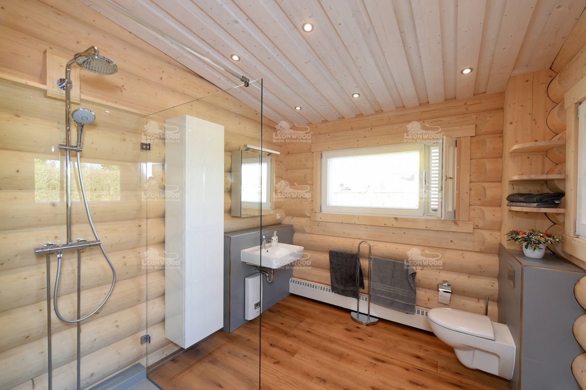 Im Inneren des Holzhauses warten helle freundliche Räume auf den Besucher. Gleich im Eingangsbereich fällt dem interessierten Holzhausfan sofort der Querschnitt des verbauten Polarfußbodens ins Auge. Der Bullerjan-Holzofen des Geschäftspartners von Léonwood kann ebenso besichtigt werden, wie das von Geschäftsführer Dieter Schenkling entwickelte lightconcept für Blockhäuser.