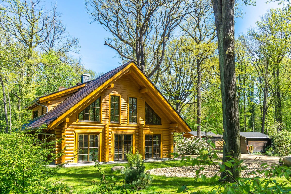Urig und traditionell kommt dieses Blockhaus daher. Stamm um Stamm baut sich die Fassade im Erdgeschoss auf, um dann in eine waagerecht verlaufende Stülpschalung überzugehen. Harmonisch fügen sich die braunen Fenster und Dachziegel in das Gesamtbild des Hauses ein.