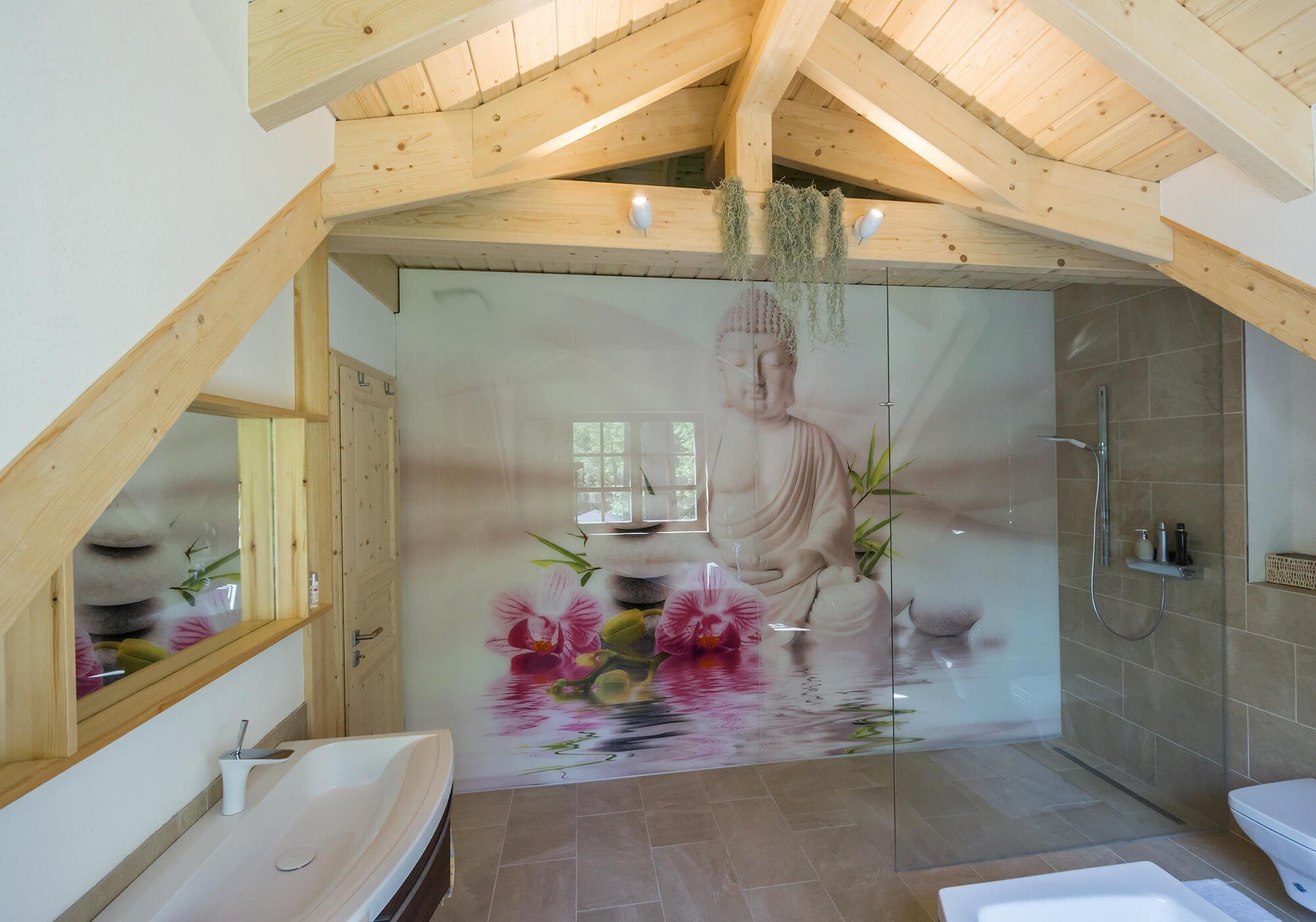Die charakteristische Außenansicht vermittelt Gemütlichkeit. Für Holzliebhaber ist der unverbaute Blick auf die Holzwände im Inneren ein besonderes Highlight. Viel Licht und offener Wohnraum sind hier maßgeblich für die Atmosphäre. Der Luftraum gibt den Blick frei bis unter den First und vermittelt den Bewohnern ein Gefühl von Weite. Ein Büro und ein kompaktes Kinderzimmer plus Duschbad komplettieren den Parterre-Grundriss. Unterm Dach gibt’s ein weiteres Familienbadezimmer sowie das Schlafzimmer nebst Ankleide. Die vorgesetzte Galerie hat Studio-Charakter.