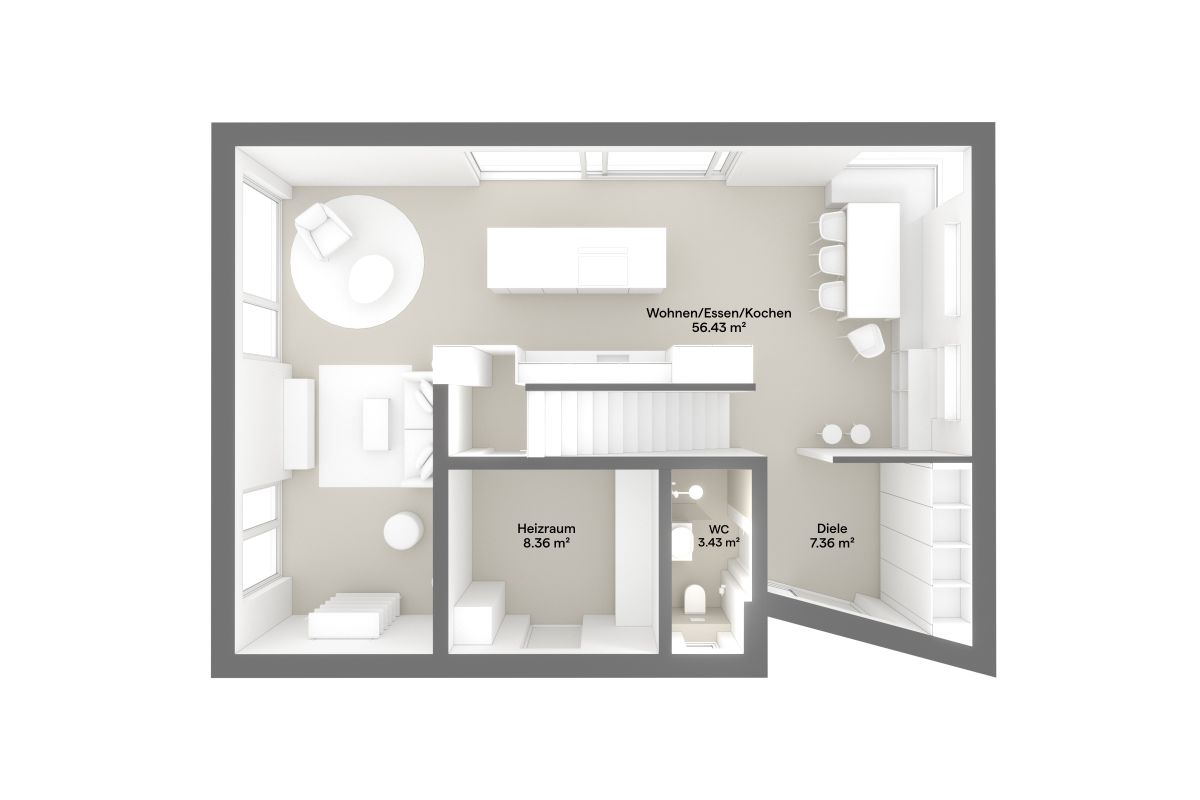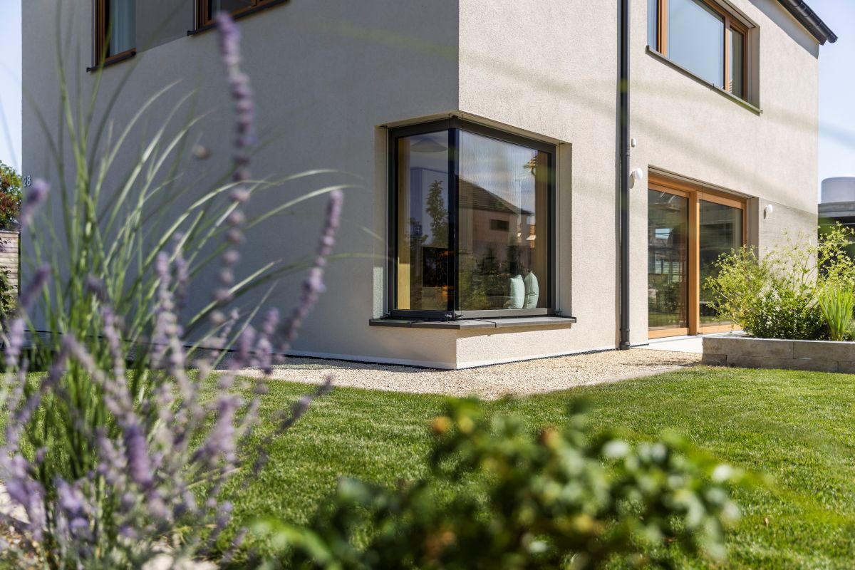 Das Musterhaus Murr ist als modernes, energieeffizient konzipiertes Beispielhaus geplant und zeigt eine großzügige, klare Raumwirkung. Ein offener Luftraum verbindet Erd- und Obergeschoss und unterstützt die räumliche Orientierung im Haus. Große Fensterflächen sorgen für viel Tageslicht. Sie belichten den Küchenbereich im Erdgeschoss und den Arbeitsplatzbereich im Obergeschoss.