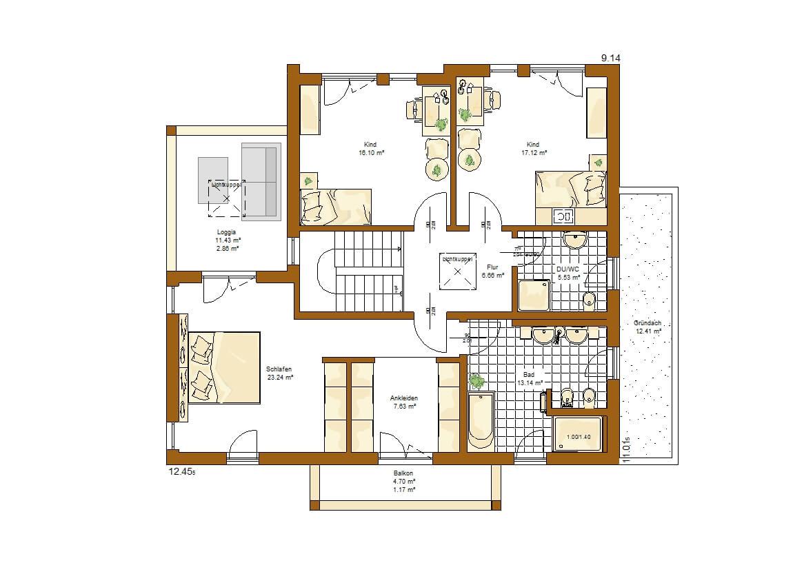 Eine Etage weiter oben ist neben den beiden Kinderzimmern mit eigenem Dusch-WC der überaus großzügige Rückzugsort für die Eltern untergebracht. Dieser auf Entspannung ausgerichtete Bereich erstreckt sich ebenfalls auf ca. 60 m² und umfasst ein Schlafzimmer mit Zugang zur überdachten Loggia, eine Ankleide mit vorgelagertem Balkon sowie einem eigenen Wellnessbad.