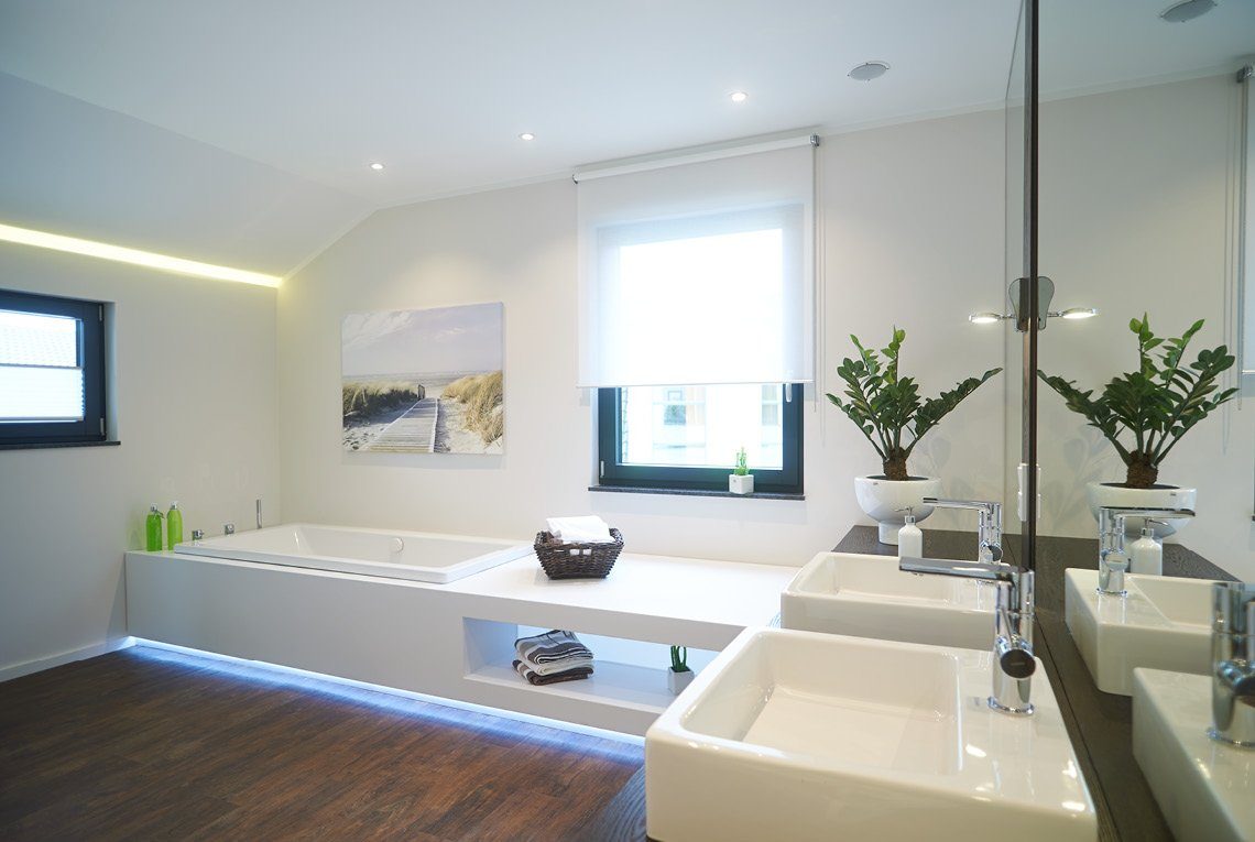 Einige unserer Highlights: Podesttreppe, offener Ankleide- und Spielbereich für Kinder und ein bemerkenswert aufgeteiltes Schlafzimmer. Insgesamt stehen im Musterhaus Bad Vilbel 168 m² Wohnfläche zur Verfügung – ermöglicht zwei Vollgeschosse mit insgesamt 167m2 – nicht eingerechnet die 26 m² des Büroanbaus und die Eingangsüberdachung.