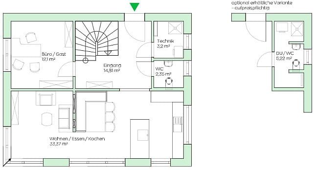 Auf wenig Fläche ist hier alles für das Familienleben untergebracht: Die – natürlich im Preis inkludierten – großen über das Eck reichenden Fenster machen den hellen Wohnbereich zum Zentrum des Hauses. Das moderne Bad und die Schlafzimmer wirken durch den nach oben offenen First noch größer und luftiger, als man vermuten würde. Kaum zu glauben, wie viel Freiraum Sie in diesem durchdachten Haus erwartet!