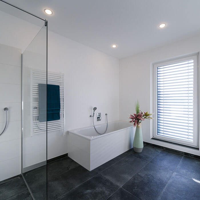 Das Highlight im Erdgeschoß ist der weiträumige, offene Wohnbereich mit seinem gemütlichen Erker, durch dessen Eckverglasung viel Sonnenschein ins Haus lacht. Im Obergeschoß hält das großzügige Elternschlafzimmer mit Ankleide sogar noch Platz für eine Leseecke bereit. Und direkten Zugang zum Balkon gibt’s obendrauf – wie für eines der beiden Kinderzimmer.