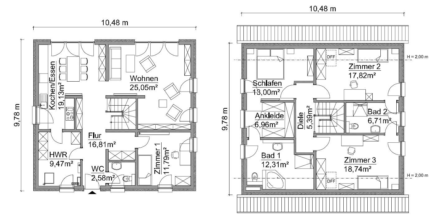 Das SH 160 D bietet einen modernen Wintergarten, welchem sich nahtlos der offene Allraum aus Wohnen, Essen und Küche anschließt. Das Gäste-WC wurde mit möglicher Dusche geplant. Im Obergeschoss ist viel Platz für Schlafzimmer, zwei weitere Zimmer und Bad – freistehende Badewanne kein Problem.