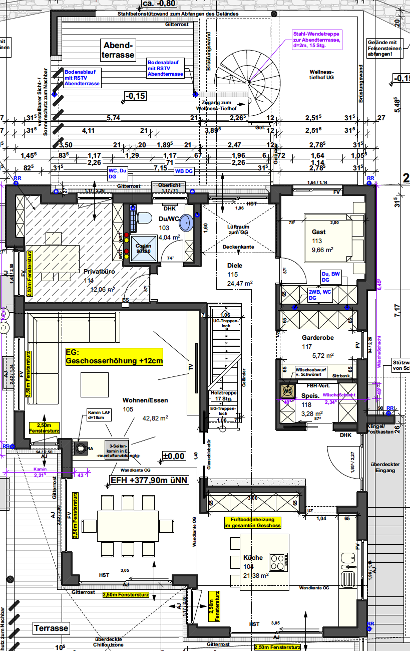 Platz im wörtlichen Sinn schafft der strukturiert angelegte Grundriss auf über 210 Quadratmetern Wohnfläche. Vor- und Rücksprünge im Baukörper gliedern den Koch-Ess-Wohnbereich in seine verschiedenen Funktionen: die geräumige Küche mit Kochinsel und Frühstückstheke ist über Fensterschiebetüren mit dem Balkon verbunden, der Essplatz wird von bodentiefen Verglasungen bzw. Fenstertüren übereck sehr schön belichtet, der Wohnbereich orientiert sich zum Kaminofen, der als Raumteiler zum Essplatz hin dient