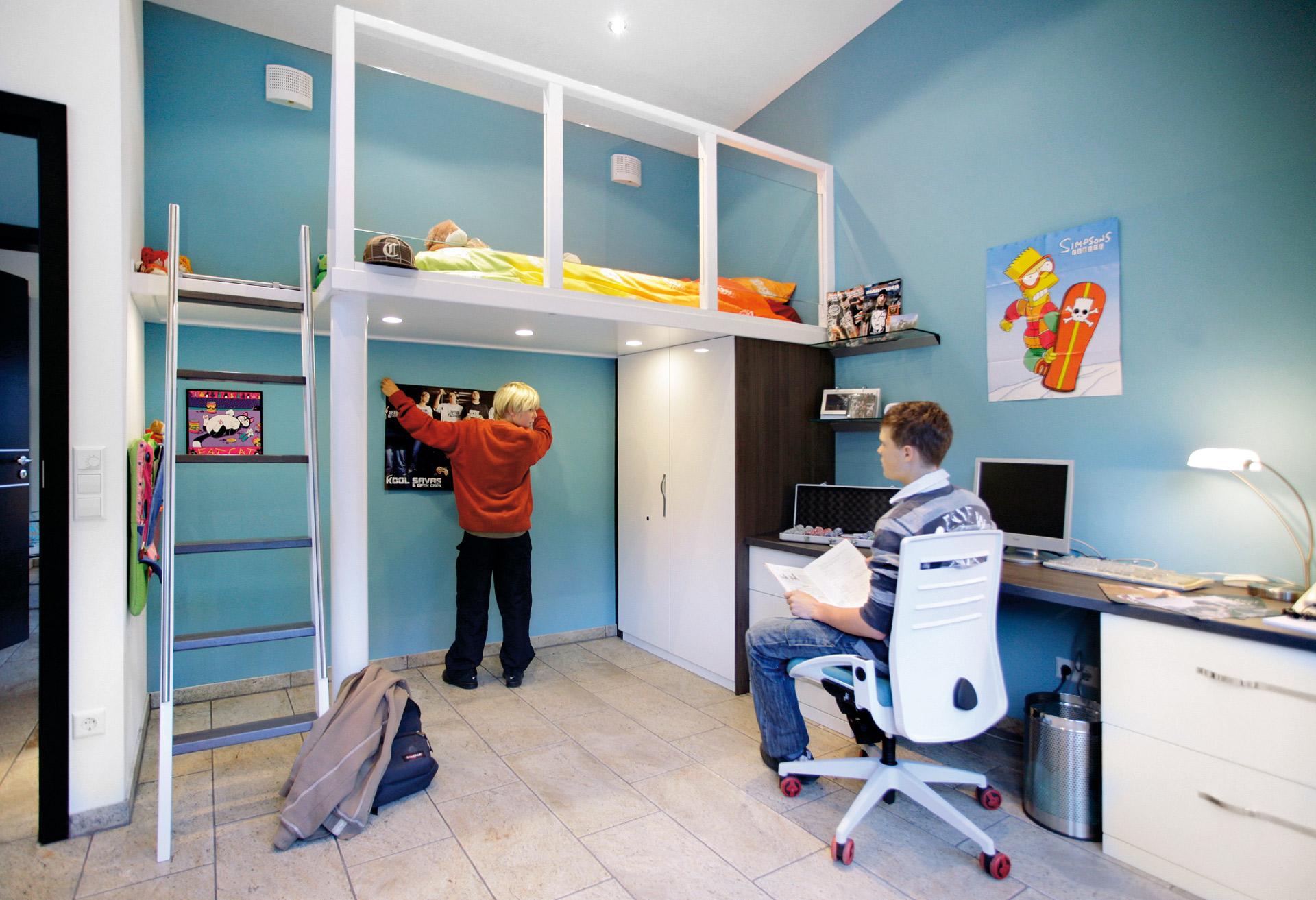 Das Obergeschoss ist vielseitig nutzbar: Zum Beispiel ganz traditionell mit drei Schlafräumen oder wie im Musterhaus vorgestellt mit Elternschlafzimmer, Kinderzimmer und großzügigem Fitnessbereich - besonders attraktiv, der offene Luftraum ins Erdgeschoss. Ergänzt wird das Raumprogramm durch ein luxuriöses Badezimmer und ein separates Duschbad.
