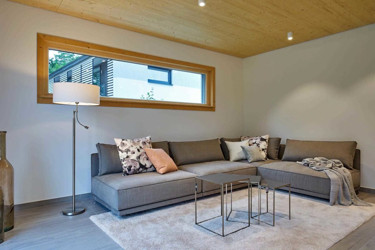 Besonderes Augenmerk wurde auch auf die Gestaltung der Fassade gelegt. Dabei wurden schmale Lichtbänder ebenso wie extra große Fenster und Fenstertüren geschickt platziert. Das Motto lautete: Licht, wo man es benötigt. Die verglaste Pfosten-Riegel-Konstruktion ermöglicht den Blick ins Innere des Hauses und durchflutet die Diele mit ausreichendem Tageslicht. Der Wohnbereich, der komplett verglast ist, bietet eine nahtlose Verbindung von Wohnen, Essen und Küche auf großzügigen 58 m². Drei raumhohe Glastüren lassen die Natur ins Haus und die optisch schwebende Terrasse erweitert den Wohnraum und verleiht ihm noch mehr Leichtigkeit.