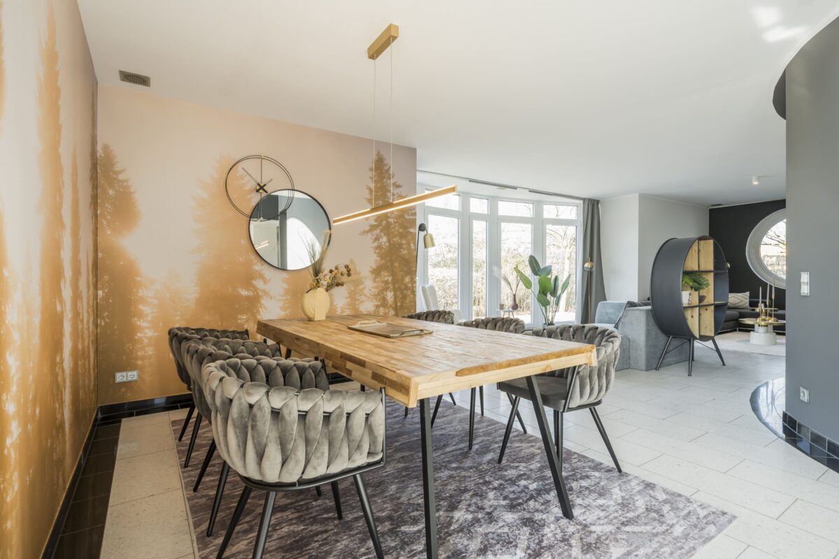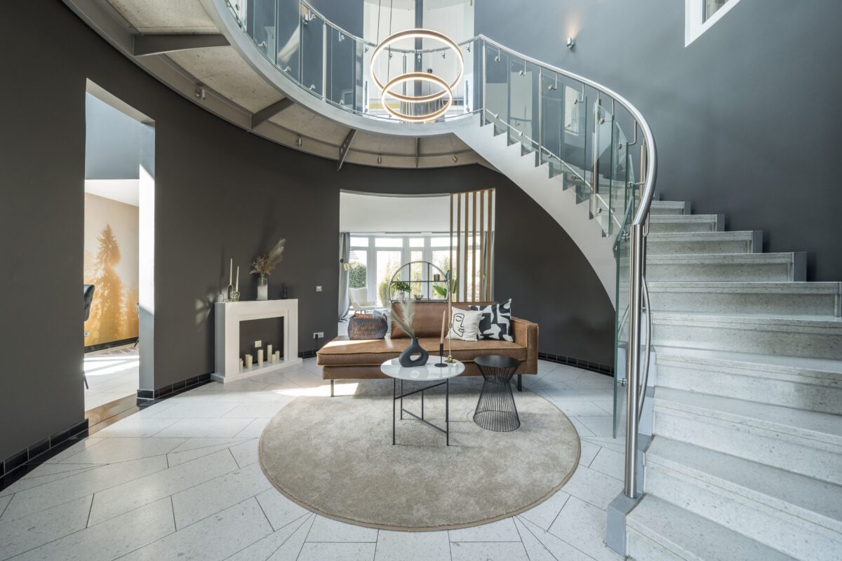 Schon im Erdgeschoss beeindruckt der Eingangsbereich mit einem freien Blick ins Atrium, das ein Gefühl von Großzügigkeit und Stil vermittelt. Die runden Wände des Atriums gliedern den großzügigen, 45 m² großen Wohnbereich und den Koch- und Essbereich – und schaffen gleichzeitig eine harmonische Verbindung zwischen beiden.