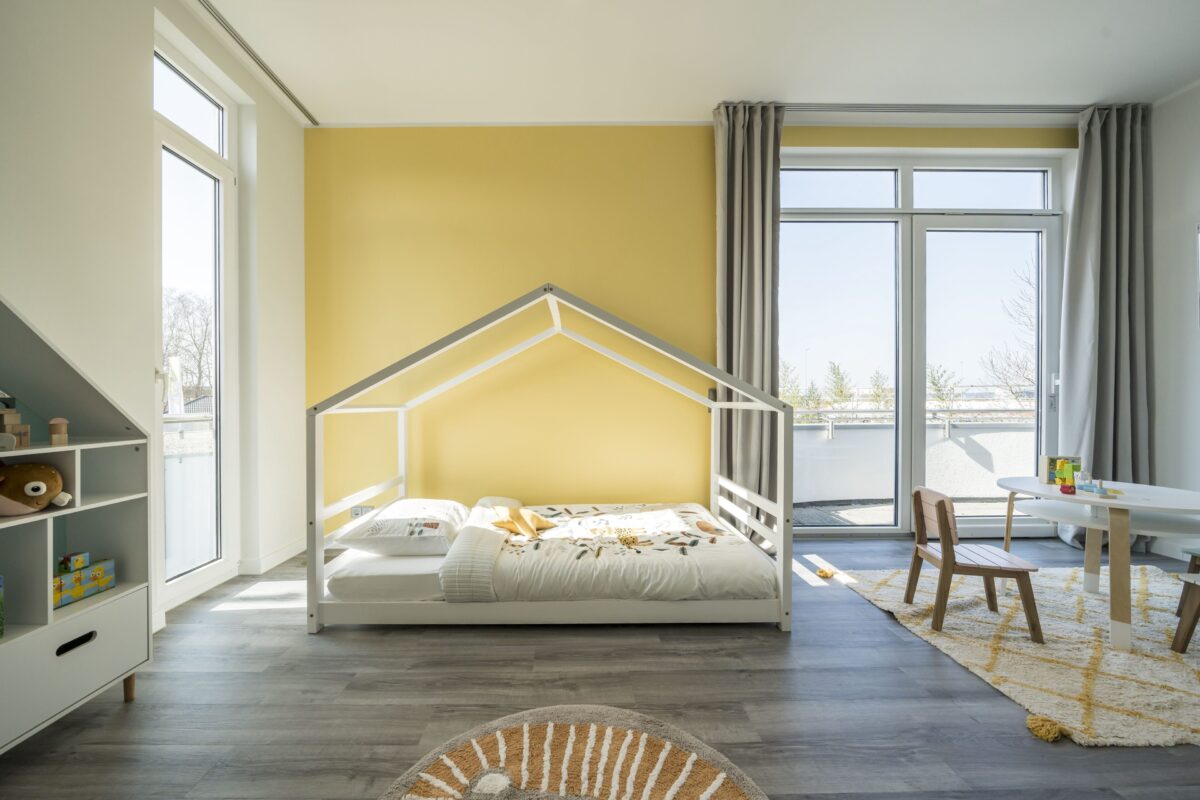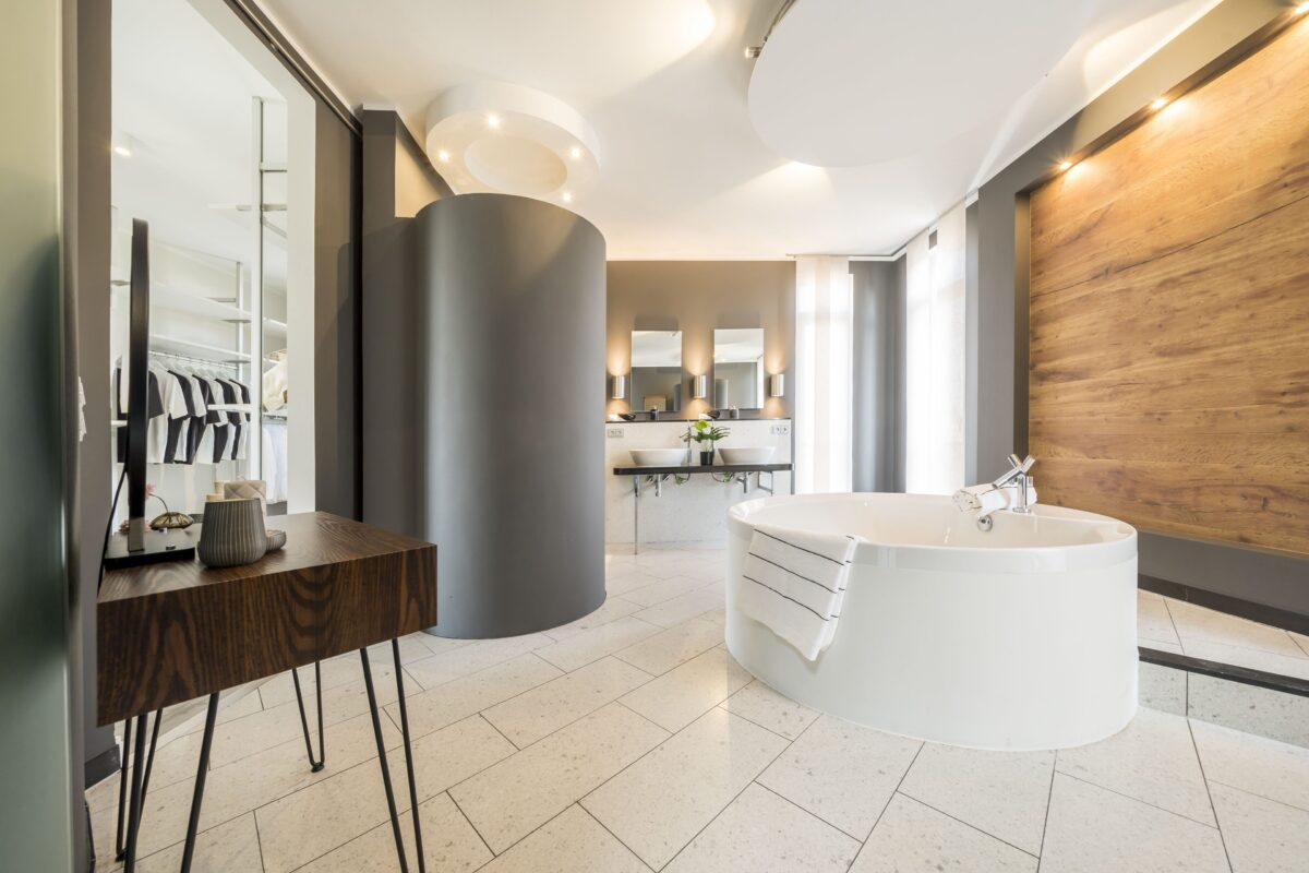 Im Dachgeschoss setzt sich das kreisförmige Konzept fort: Ein Rundgang um das Atrium verbindet das Kinderzimmer mit dem Elternschlafzimmer, das über einen geräumigen Ankleideraum und direkten Zugang zum Badezimmer verfügt. Das Bad selbst besticht durch seine außergewöhnliche Gestaltung mit einer separaten Runddusche.