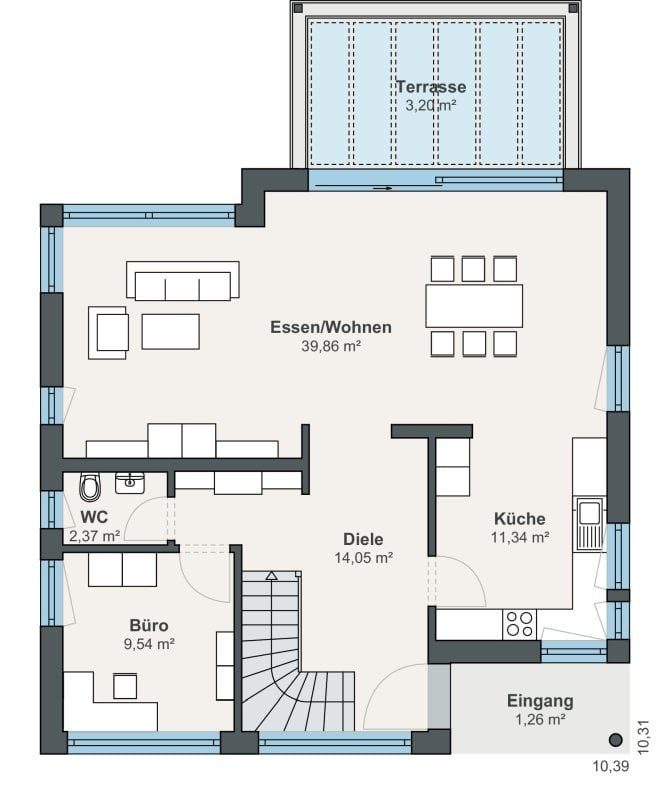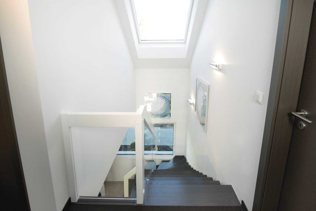 Typisch Baureihe: Auch das neue Balance 250 lässt viel Raum für sich verändernde Wünsche und Vorstellungen bei der Nutzung der Wohnfläche. Gleichzeitig bietet das Haus auf ca. 150 m² Wohnfläche viele durchdachte Details. Den zurückgesetzten Hauseingang zum Beispiel - für den trockenen Zugang zum Haus. Die Pergola aus Holz mit Glaseindeckung. Oder die Flachdachgaube für mehr Wohnfläche im Dachgeschoss. Weitere Möglichkeiten: die Photovoltaikanlage, hier als Indach-Montage. So wird Ihr Haus zum eigenen kleinen Kraftwerk.