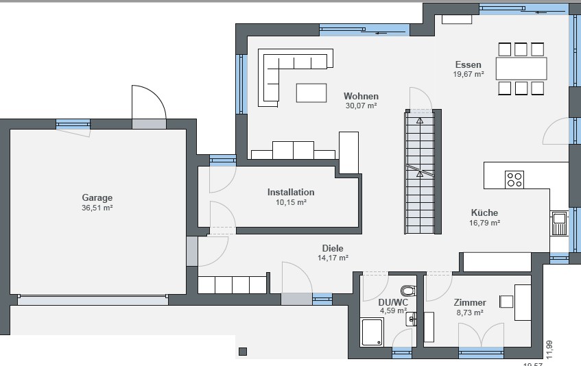Schritt für Schritt nahm das Traumhaus in den Gedanken der Bauleute Gestalt an. Eine Stadtvilla mit zwei Vollgeschossen, bodentiefen Fenstern und einem offenen Grundriss sollte es werden. Neben diesen „Basics“ kristallisierten sich drei weitere Details für das eigene Zuhause heraus: eine gerade Treppe in Faltwerkoptik mit Glasgeländer, die den Mittelpunkt des Hauses bildet, einen grau abgesetzten Übereck-Erker, der dem Haus einen unverwechselbaren Charakter verleiht, und eine Garage, die sich harmonisch in das Gesamtbild einfügt