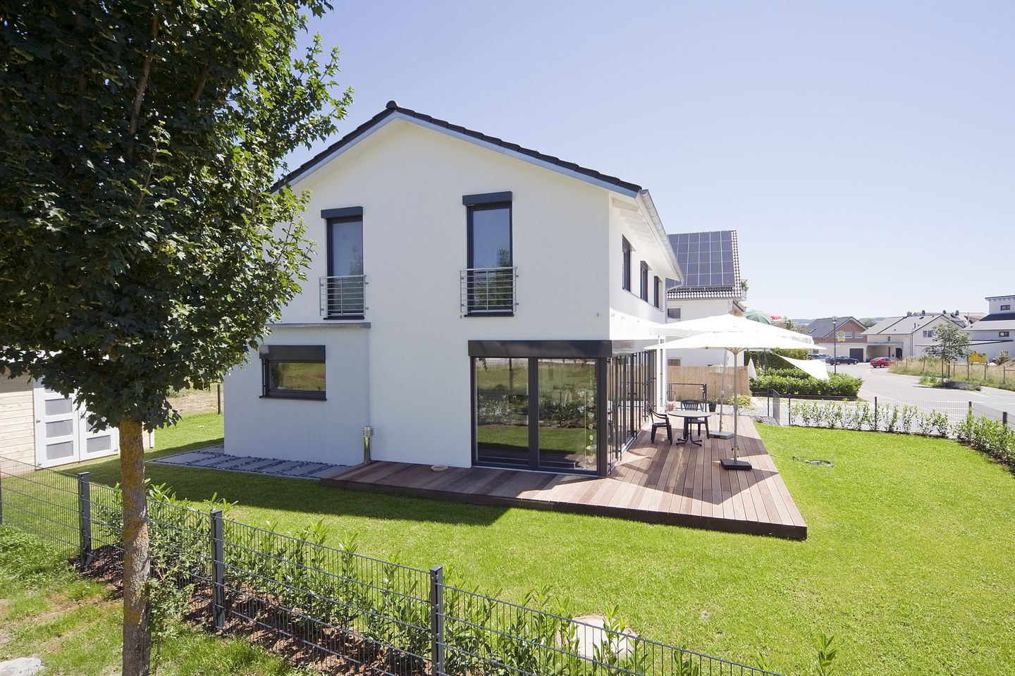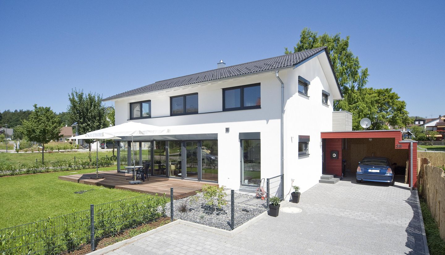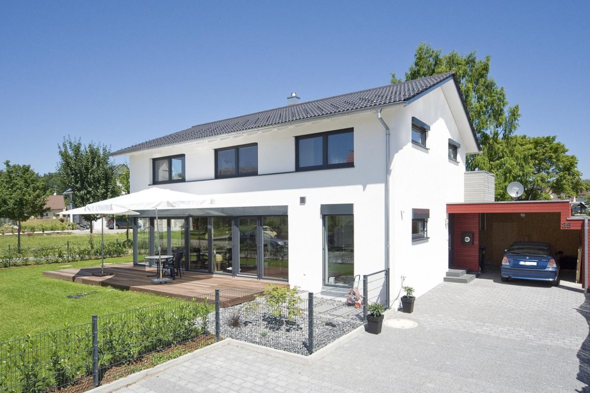Haus Haug ist ein kompakter Entwurf, zweigeschossig, schnörkellos, in Anthrazit und Weiß. Ein flaches Satteldach und reduzierte Dachüberstände stehen für moderne, urbane Architektur, mit einer Breite von nur 8 m eignet sich der Entwurf auch für schmale Grundstücke. Der lang gestreckte Baukörper wird auf der Rückseite von einem kubischen Anbau mit Holzschalung ergänzt, eine Garage setzt einen Farbakzent in kräftigem Rot.