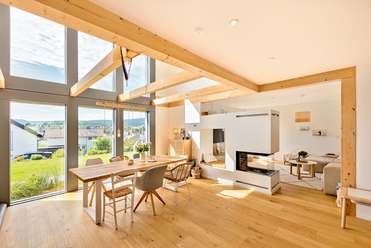 Der nach oben offene Luftraum zur Galerie über dem Lebensbereich wird von der offenen Balkenlage dominiert, deren natürlicher Holzton durch die Ausstattung mit dem passenden Holz-Parkett zusätzlich hervorgehoben wird. Bodentiefe Fenster und der komplett verglaste Galerie-Bereich sorgen hier zudem für jede Menge Tageslichteinfall und ein freundlich-helles Wohnambiente.