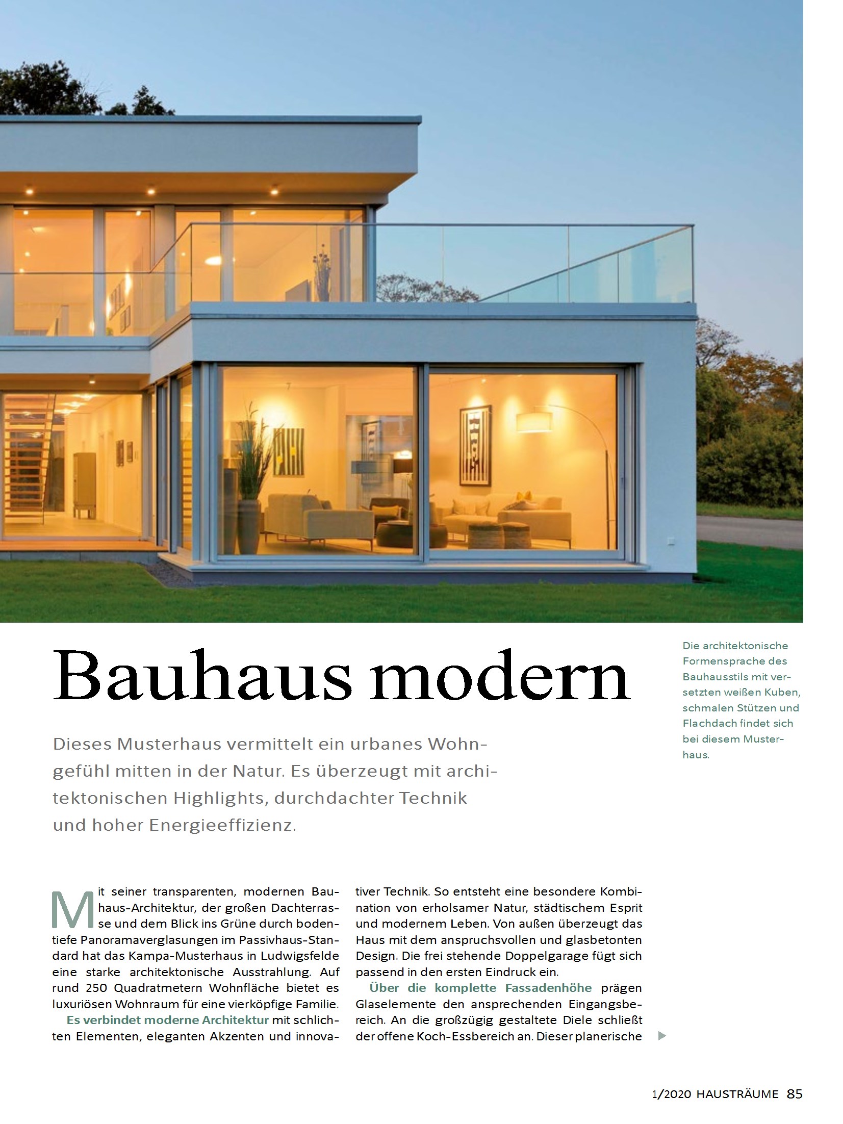 Das Kampa-Haus Kubos-Bauhaus in Ludwigsfelde ist ein Musterhaus im Passivhaus-Standard, das auf 250 Quadratmetern Wohnfläche luxuriösen Wohnraum für eine vierköpfige Familie bietet. Mit seiner transparenten, modernen Architektur und großen Dachterrasse wird das Haus hervorgehoben. Die bodentiefen Panoramaverglasungen erzeugen ein grenzenloses Gefühl von Natur und Räumen. Die schlicht gestaltete, lichtdurchflutete Galerie verbindet den Eltern- mit dem Kinderbereich. Das Smarthome-System mit Abschließbaren Fenstergriffen, Überspannungsschutz, Rauchmelder und weitere Sicherheitsstandards garantieren zusätzlichen Schutz im Eigenheim. Eine Sauna, eine Regendusche und eine frei stehende Badewanne mit Blick ins Grüne sorgen für Entspannung und Erholung. Das Haus vereint moderne Architektur mit schlichten Elementen, eleganten Akzenten und innovativer Technik.