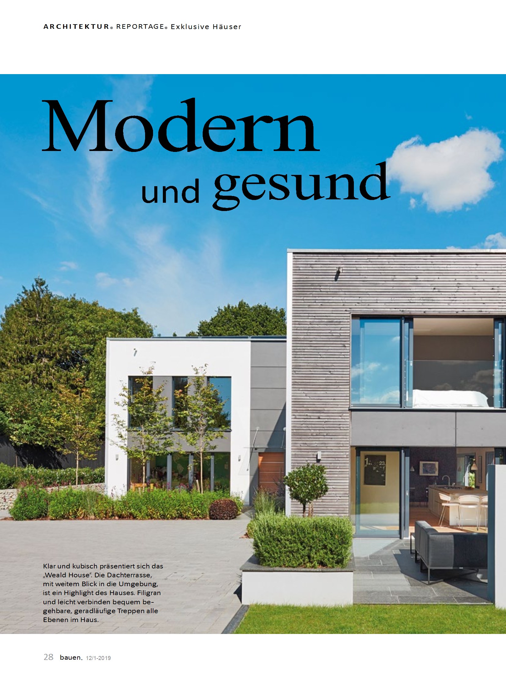 Der Artikel biete eine Reportage über das „Weald House“, das von „Bau-Fritz“ entworfen wurde. Das Haus besteht aus einer Holzverbundkonstruktion, hat eine biologische Hobelspan-Dämmung und eine Holz-Putzfassade und Fassadenplatten. Es verfügt über eine Gas-Brennwertheizung, eine Solaranlage, Fußbodenheizung und eine automatische Lüftungsanlage. Das Haus ist ein Effizienzhaus 55, hat einen Primärenergiebedarf von 30 kWh/m2 im Jahr und einen Heizwärmebedarf von 34 kWh/m2. Auf der Internetseite von „Bau-Fritz“ können weitere Entwürfe gefunden werden. Das „Weald House“ hat ein offenes Design, das den Wohn-, Ess- und Kochbereich umfasst. Ein schwarzer Raumteiler trennt den Wohn- vom Kochbereich ab. Das Obergeschoss verfügt über zwei Kinderzimmer, ein Gästezimmer, ein Arbeitszimmer, ein Waschraum und einen Privatbereich, bestehend aus Schlafzimmer, Ankleidezimmer und Badezimmer. Auf dem Dach gibt es eine Bibliothek mit Studiocharakter und eine Dachterrasse. Das Haus verfügt über eine behagliche Raumtemperatur.