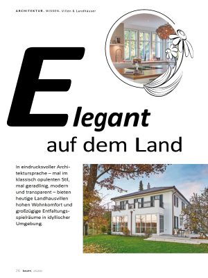 In den vorliegenden Artikeln geht es um verschiedene Landhausvillen und deren architektonische Merkmale. Auf Seite 2 wird eine große Landhausküche mit langer Kochinsel und im historischen Stil gefertigte Fenstergriffe beschrieben. Individuelle Grundrissgestaltung wird auch erwähnt, darunter eine Bibliothek im verglasten Erker und ein Wellnessbad mit Sauna. Auf Seite 3 wird eine Villa beschrieben, die von einem liebevoll angelegten Teich und altem Baumbestand umgeben ist, inklusive großzügigem Schlafraum mit integrierter Ankleide und bodentiefem Fenster für Ausblicke ins Grüne. Die Villa verfügt auch über einen Wohn-Essbereich mit Küche und großflächigen Fenstertüren zum Garten. Auf Seite 4 wird das Kundenhaus Chelsea beschrieben, eine großzügige Landhausvilla mit opulenter Außenwirkung und erweiterter Wohnfläche dank zwei Erkern. Auf Seite 5 wird ein modernes Familienhaus in Landhausvilla-Stil beschrieben, ergänzt mit Elementen moderner Architektur und großzügigen Glasfenstern und -schiebetüren zum Garten. Eine geräumige Wohnküche und ein Wohn-Essbereich mit Sofa-Landschaft runden das Bild ab.